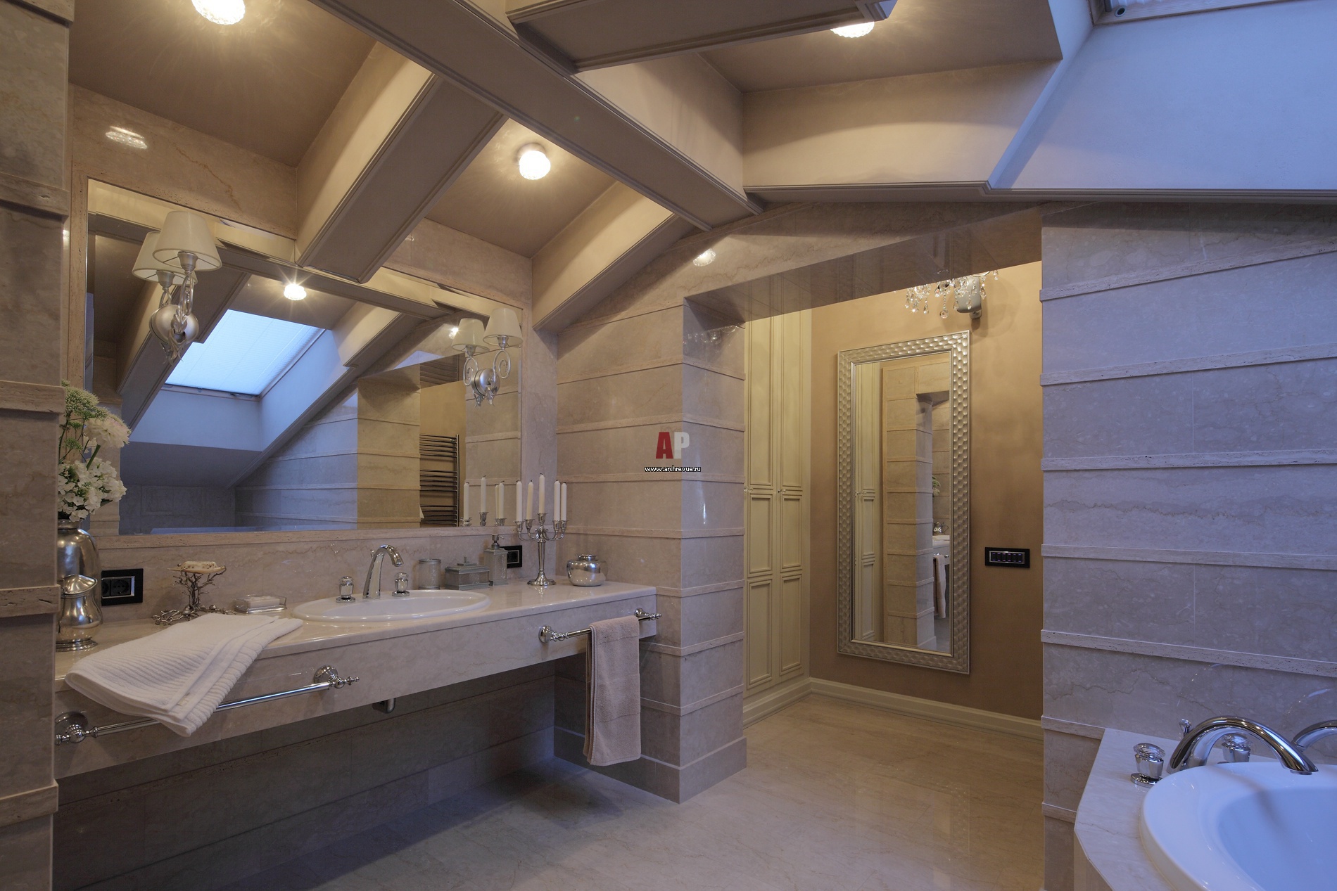 Изначально в ванной комнате хозяев был очень низкий потолок, поэтому было решено раскрыть кровлю до самых балок и зашить их, подчеркнув скат. Ванная комната облицована рустованным мрамором того же сорта, что и лестница, изготовление «АРДО». Потолки оформлены декоративными штукатурками.