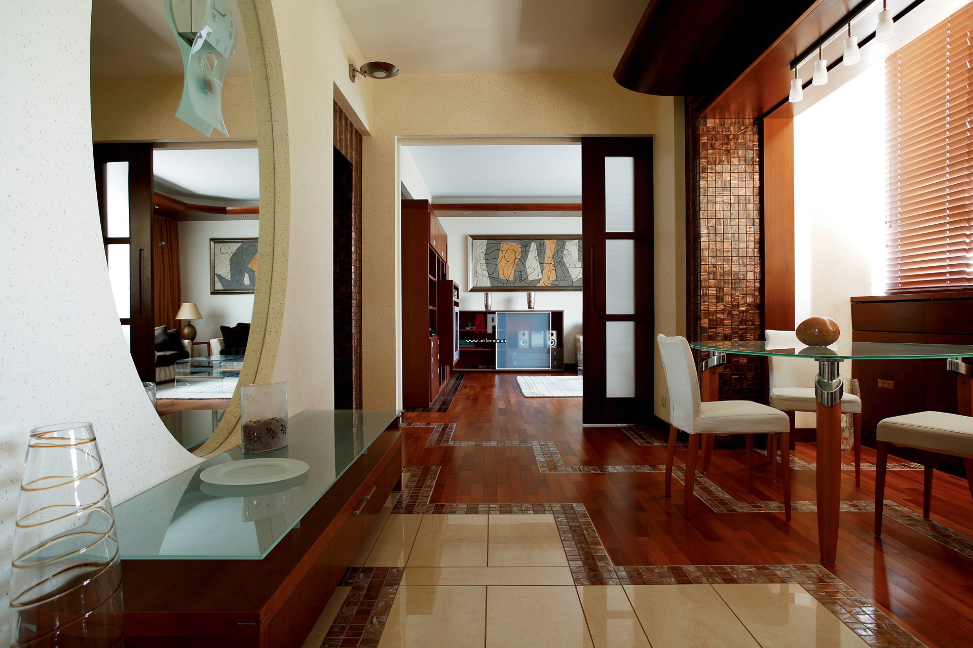 Вид из столовой на гостиную. Раздвижные стеклянные перегородки легко трансформируют пространство. Мозаикой облицованы порталы дверей и окон, в виде ступенчатых зигзагов выложены полы.