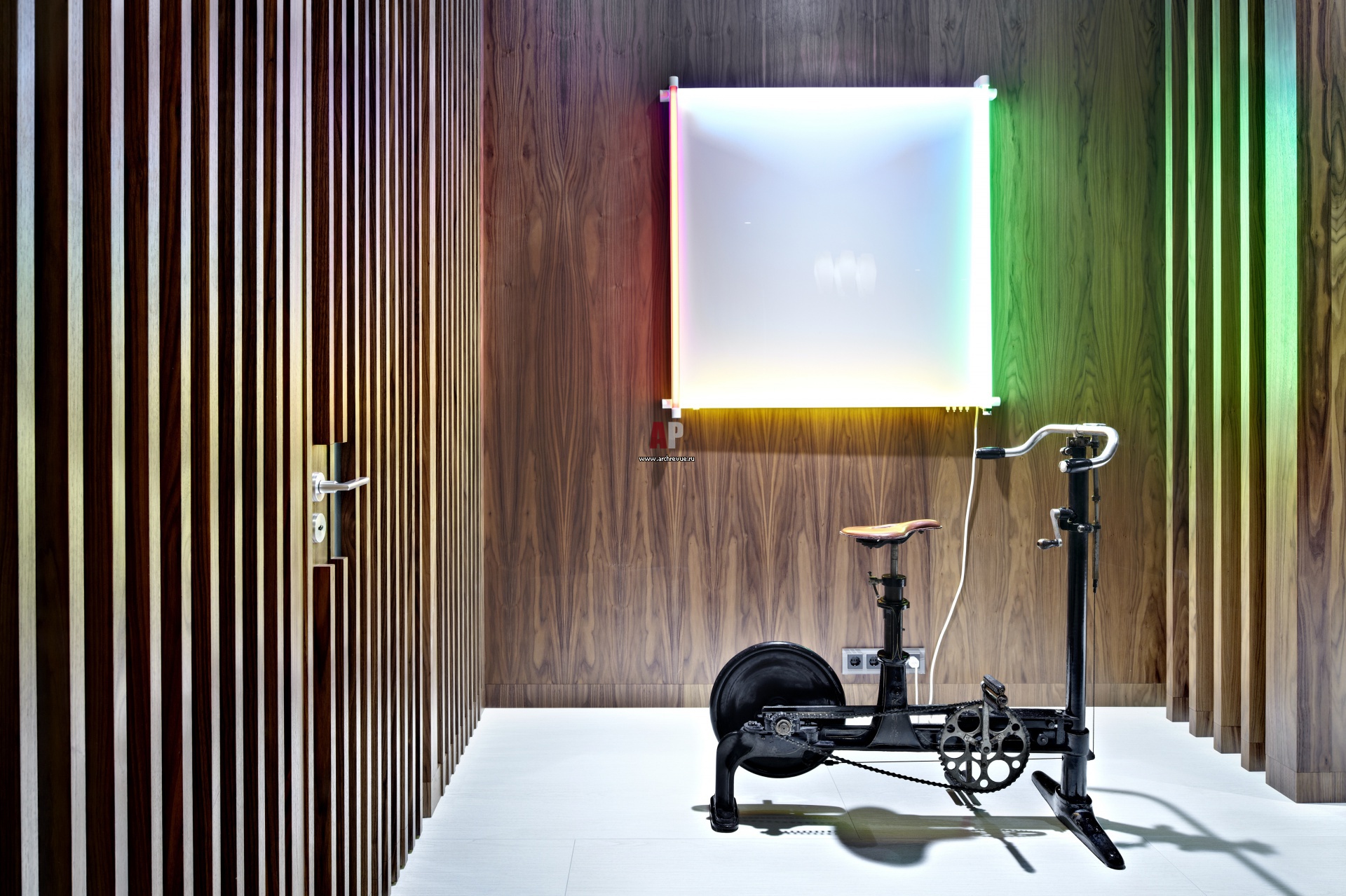 Стены кабинета зашиты панелями из древесины ореха. На ней – световая инсталляция нидерландского художника Альдо ван ден Ньивелара 1980-х гг, рядом - велотренажер конца XIX века.