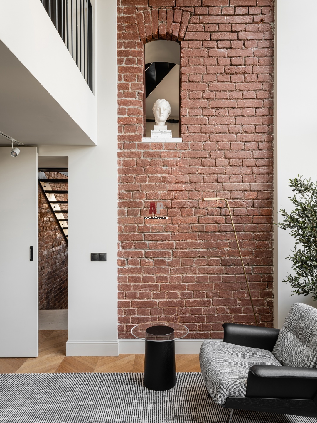 Интерьер гостиной с исторической кирпичной кладкой и сохраненным оконным проемом.
