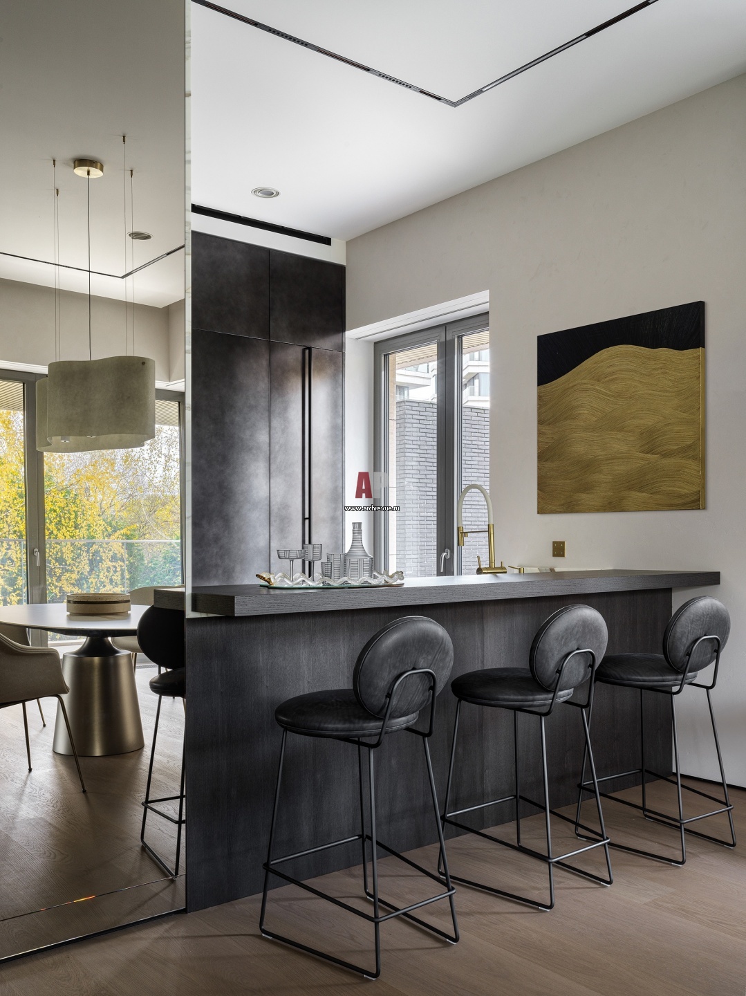 Артистичная квартира для семьи. Зона кухни в общей гостиной. Кухня с островом, Boffi. Барные стулья, Baxter.