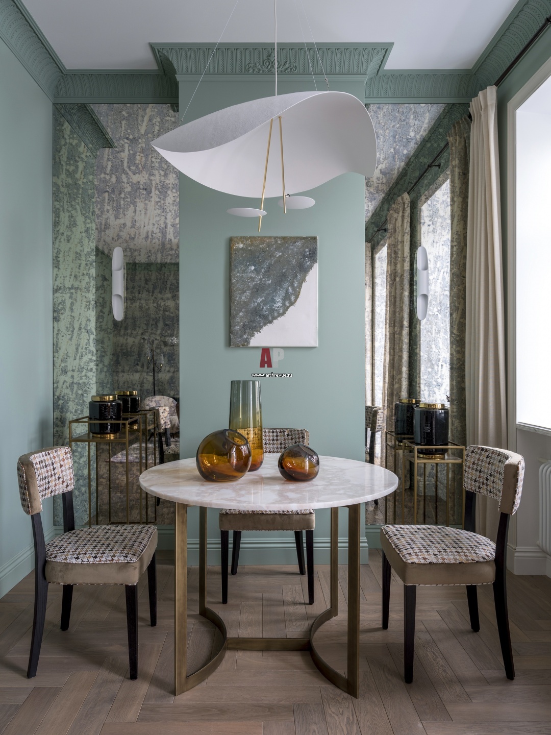 Симметричная композиция столовой группы. В ниши по обе стороны от обеденного стола вставлены витражи из состаренного зеркала. Подстолье стола выполнено из латуни.