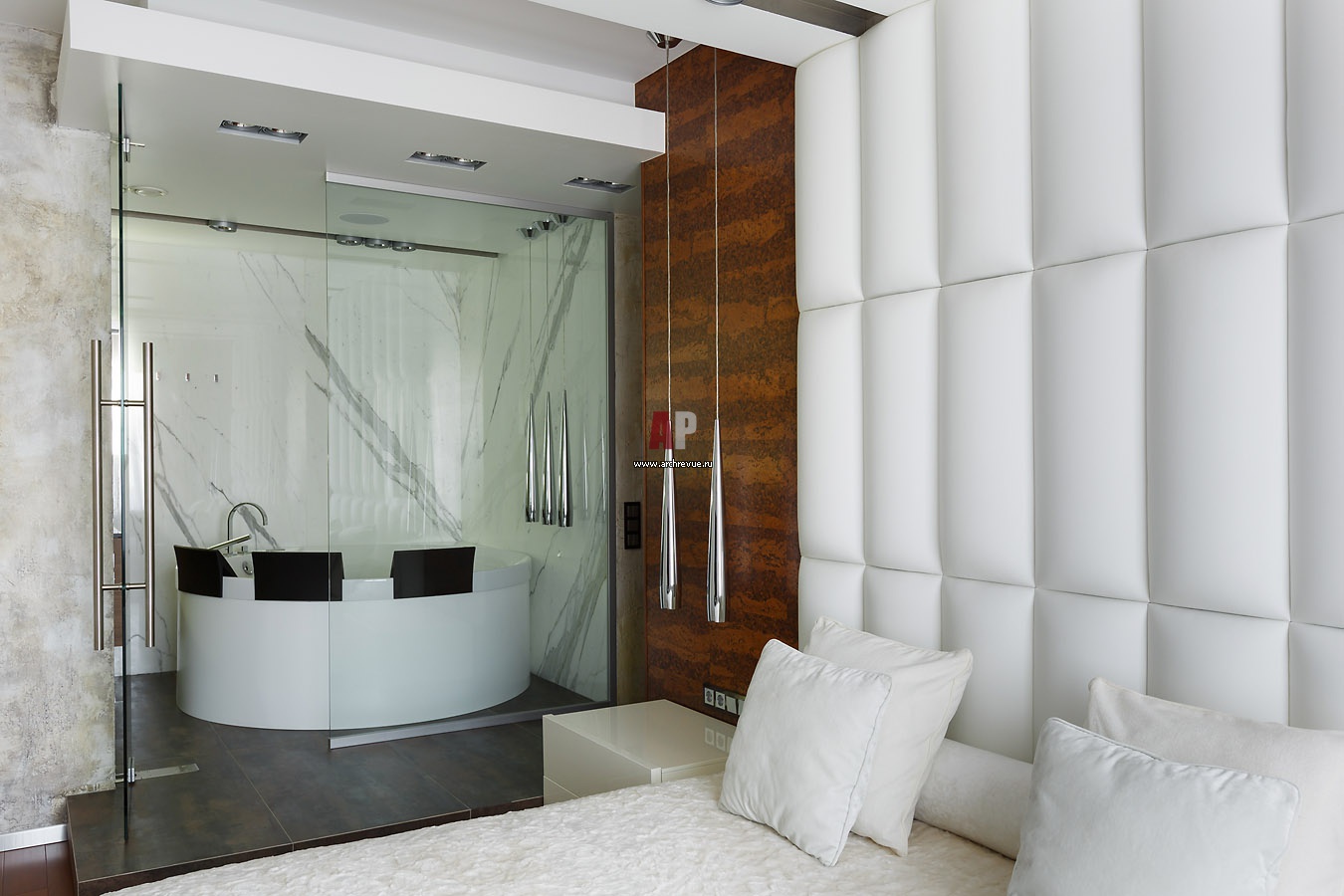 Между хозяйской спальней и ванной установлены стеклянные распашные двери. Стена за изголовьем кровати обита панелями из белой кожи, с боков они обрамлены пробковыми панелями медового цвета. Круглая гидромассажная ванна воспринимается как часть помещения спальни.