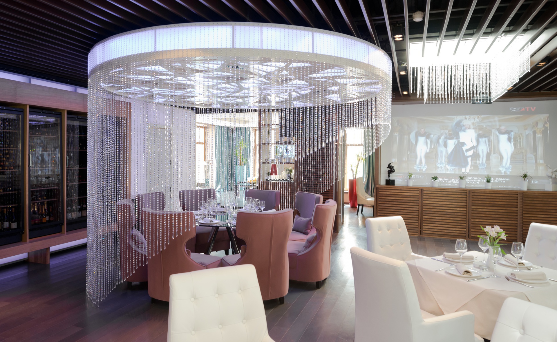 Фото интерьера зала ресторана с элементами стиля гламур. Один из акцентов основного зала – посадочная зоны внутри ниспадающего хрустального светильника. Объемное решение «люстры-паутинки» появилось немного спонтанно. Интересный вид композиции придают подвески из хрустальных нитей.