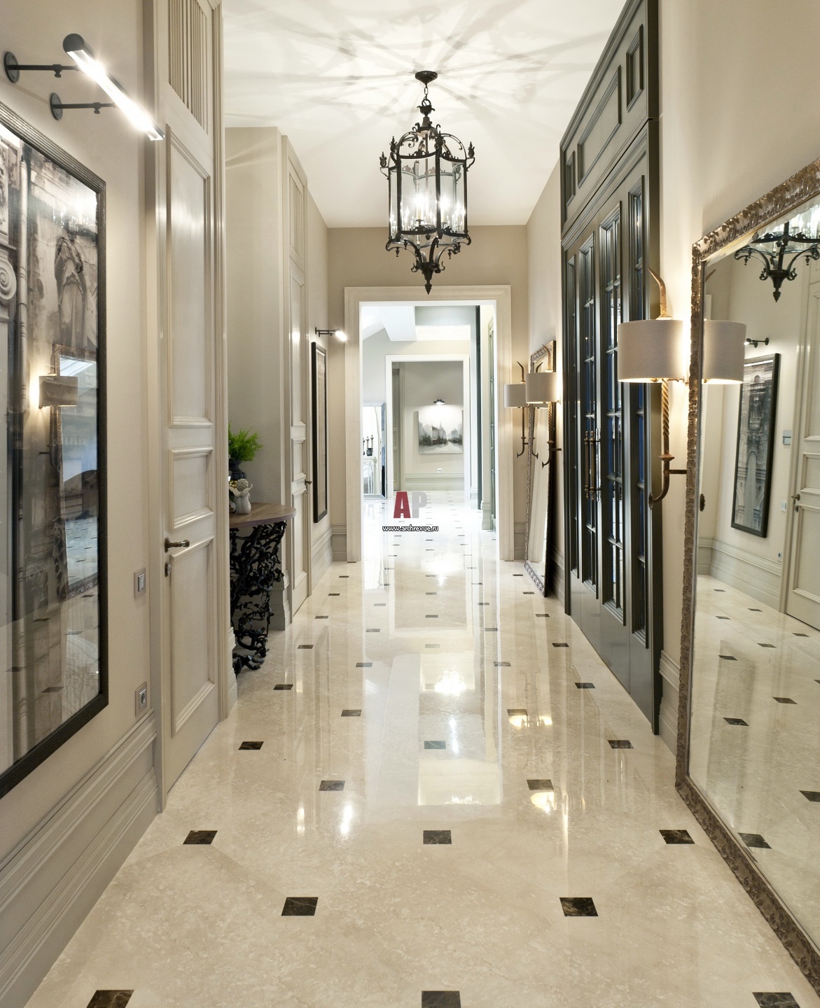 Холл в стиле неоклассика украшен зеркалами в золотых багетах.