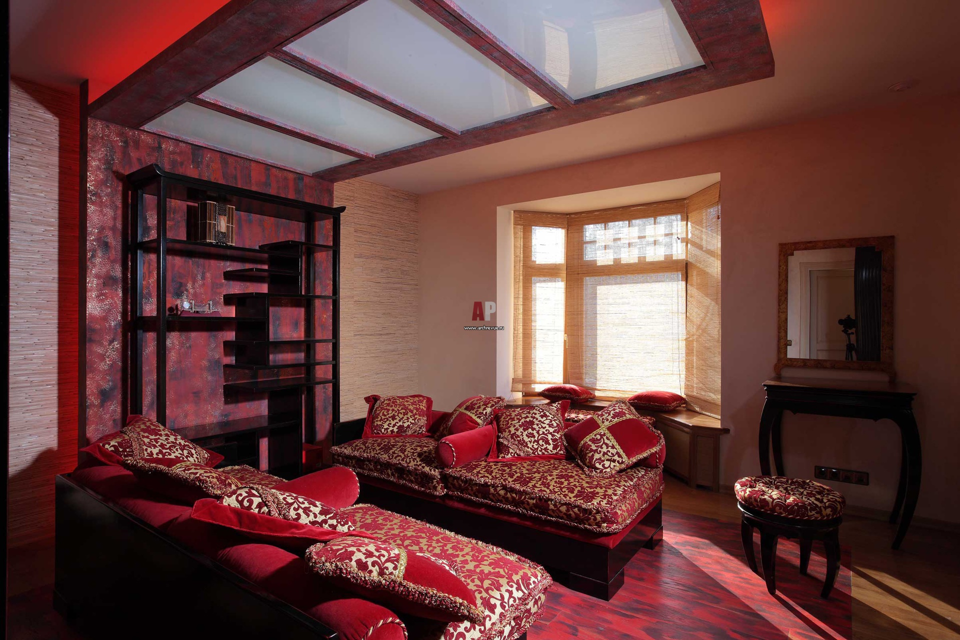 Красная с фиолетовыми сполохами паркетная доска – приобретение хозяйки. Мастера по финишным покрытиям воспроизвели ее рисунок с помощью красок и шпаклевок на стене и потолке. Ориентальный интерьер дополняют бамбуковые обои, низкая лакированная мебель, стеллаж из красного дерева, производитель Shortway Co
