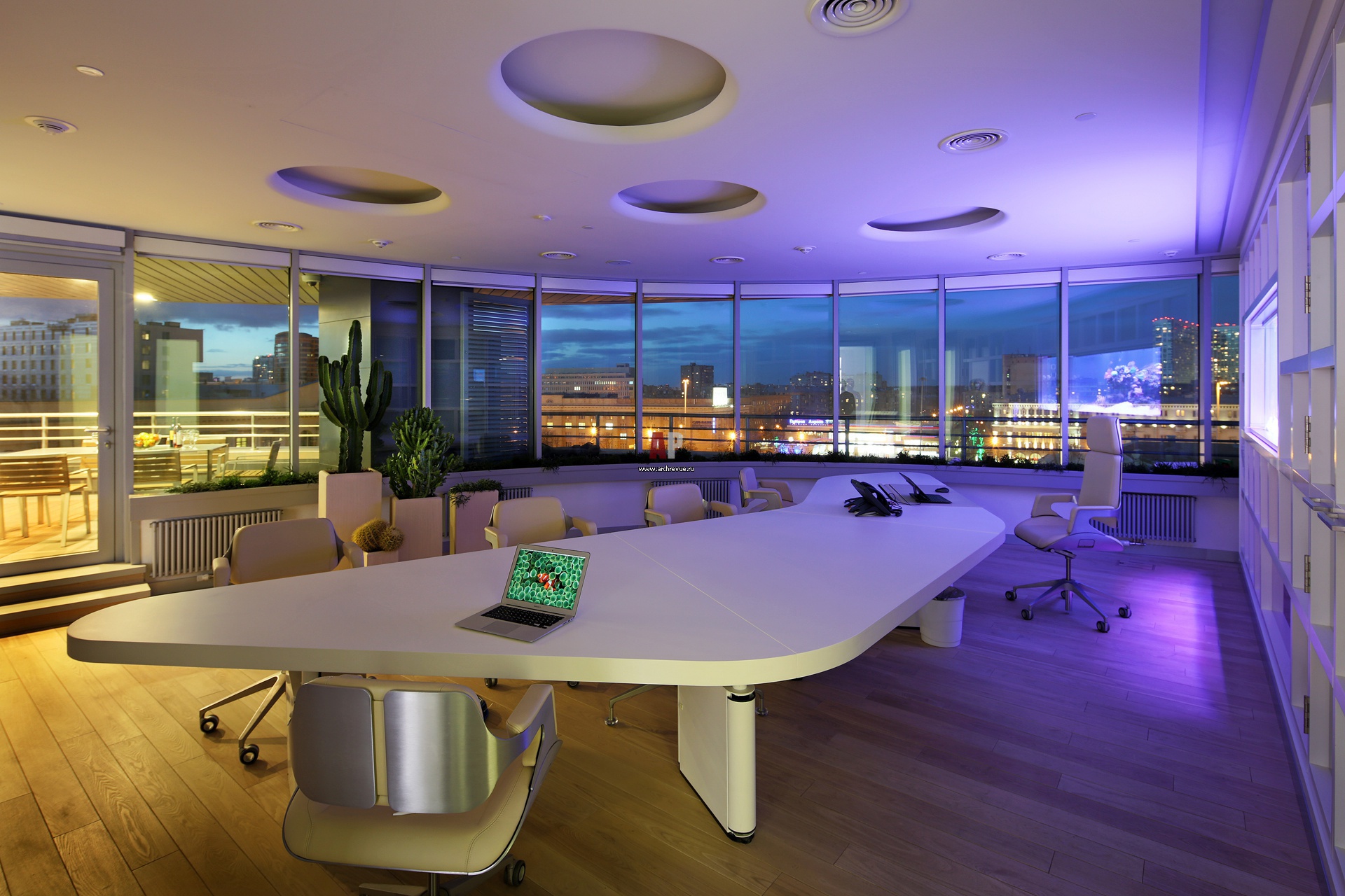 Фото интерьера VIP-кабинета в современном офисе. Белый рабочий стол обтекаемых, футуристических форм максимально удобен для работы в коллективе.