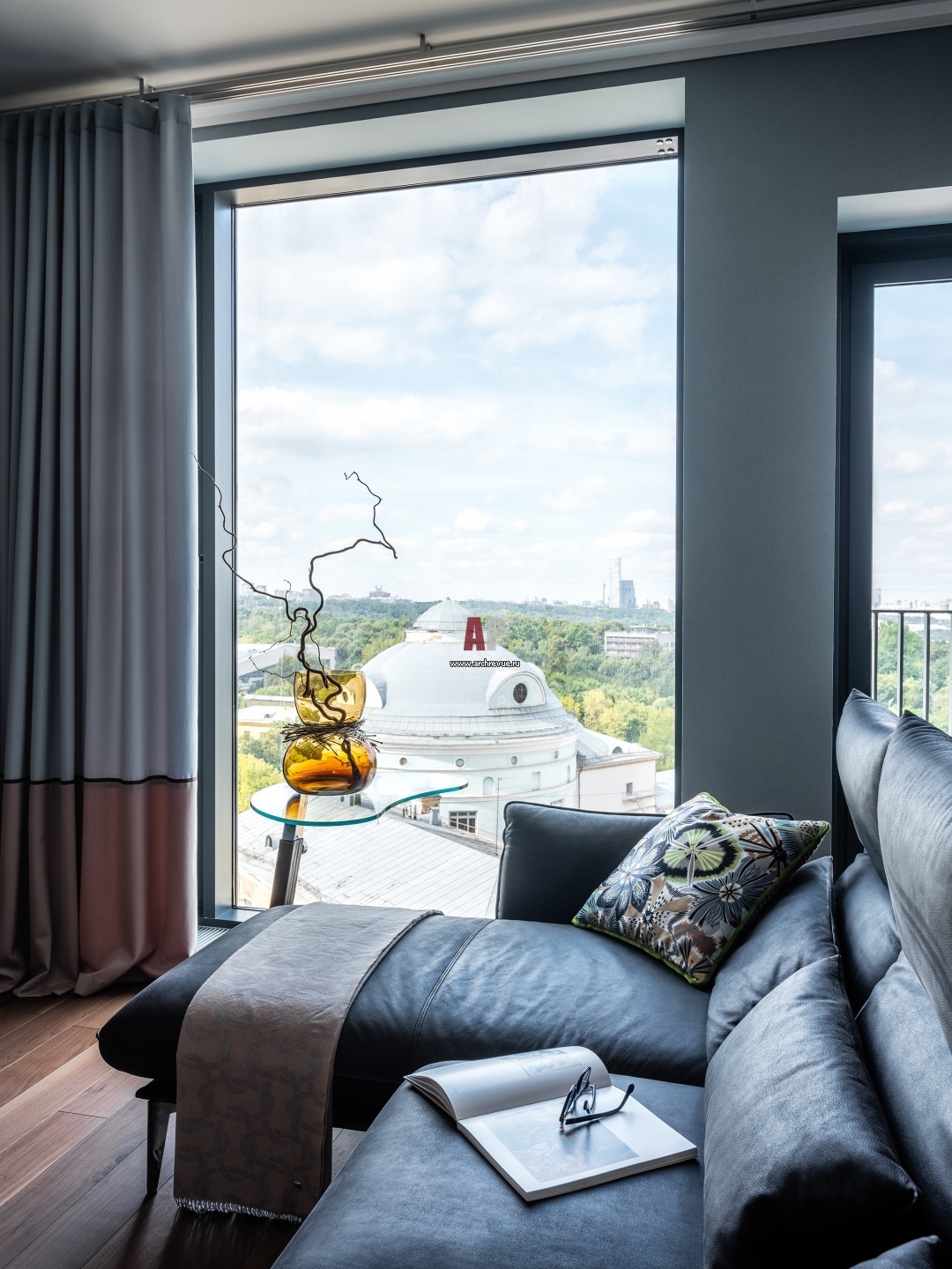 Интерьер панорамной квартиры в комплексе апартаментов на Воробьевых горах. Интерьер гостиной.