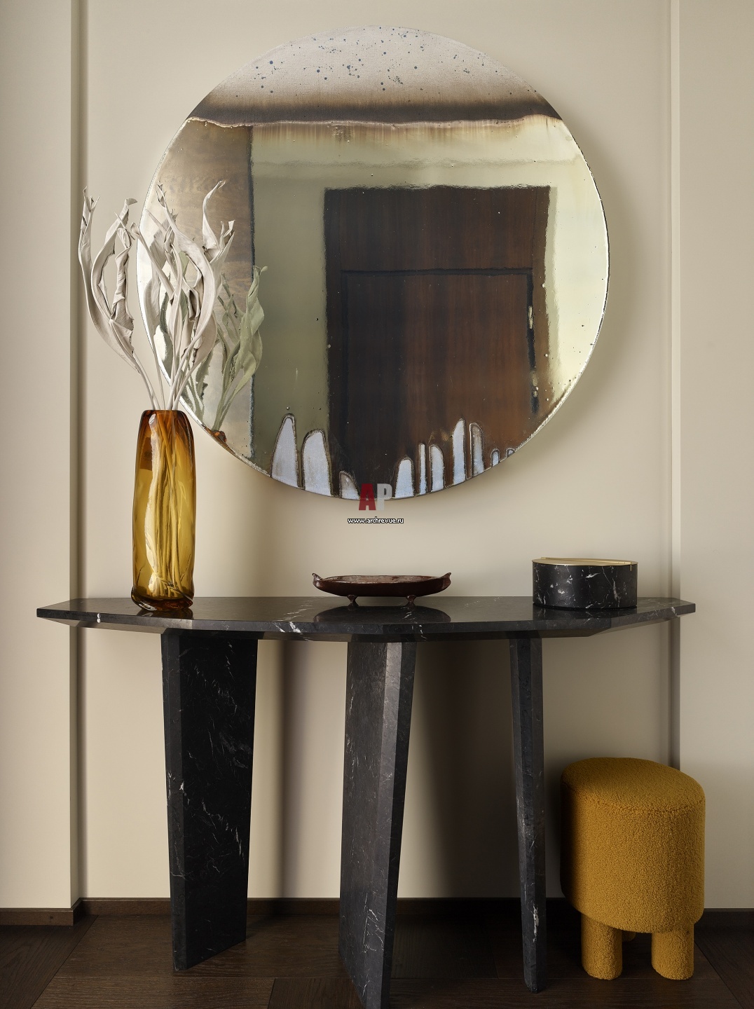 Семейные апартаменты в Москва-Сити с актуальным дизайном. Прихожая. Консоль, Ginger & Jagger. Пуф, Мехо. На стене – работа Антона Конюхова.