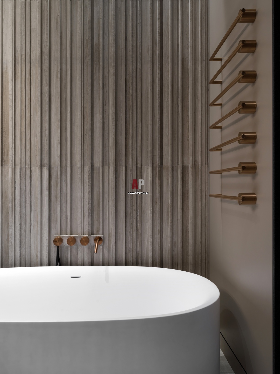 Двухэтажный пентхаус с брутальными фактурами. Мастер-ванная. Рельефное панно выполнено из натурального камня. Ванна, Boffi.