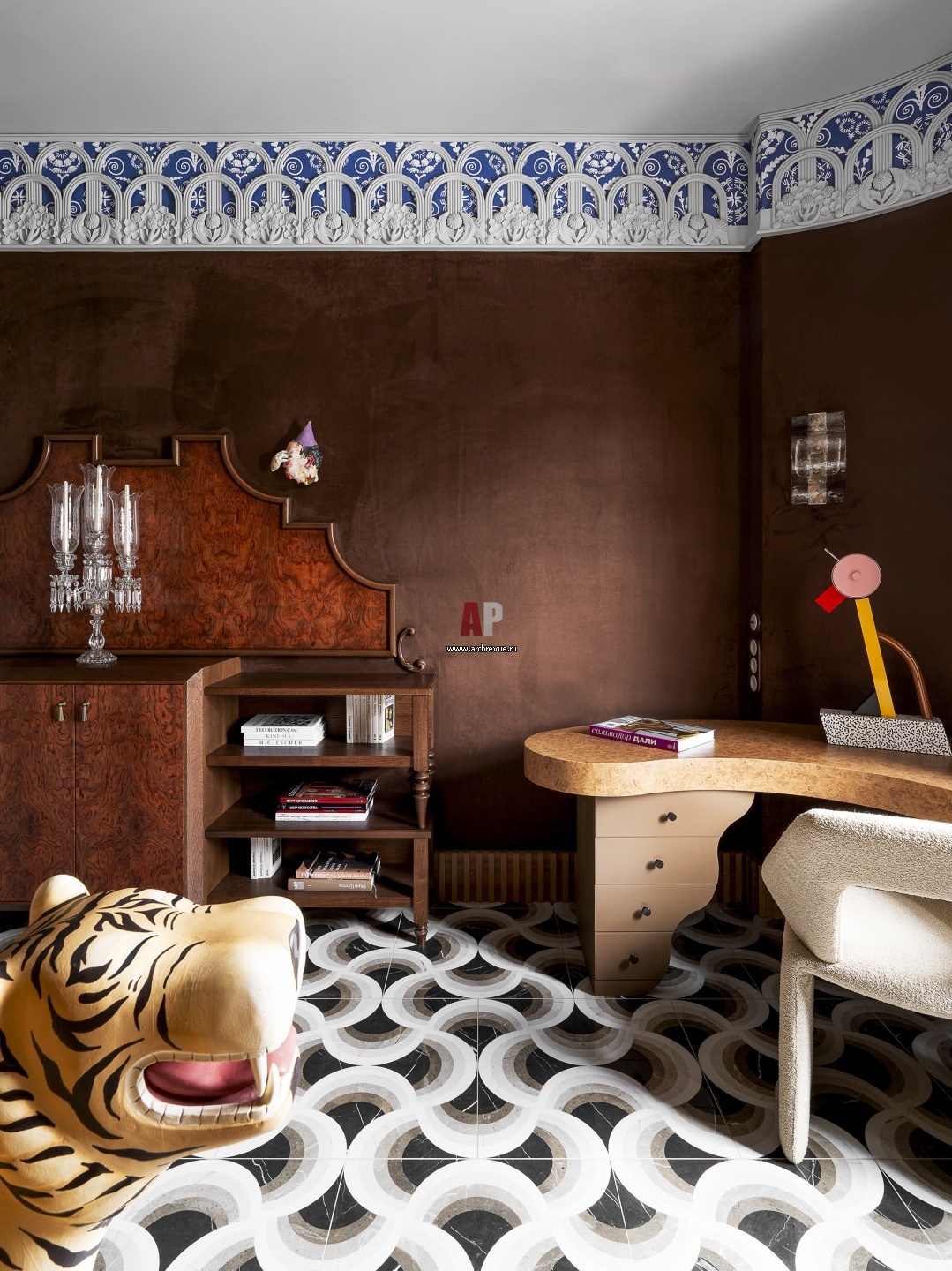 Спальня с эпатажным дизайном. Буйство решений и цветов смягчают замшевые обои, Yana Svetlova Wallcoverings. Декоративный фриз покрывает кружевной тончайший орнамент, созданный по эскизу дизайнера. Он вошел в каталог новинок производителя.