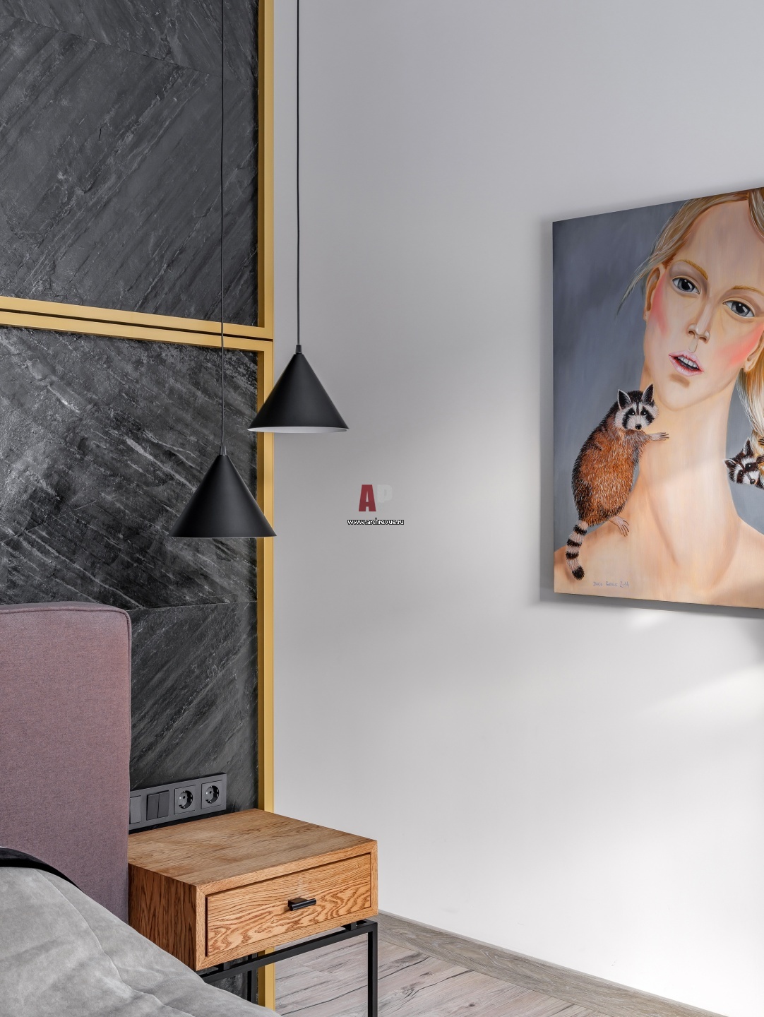 Главная спальня. Стена за изголовьем кровати облицована панелями из натурального черного сланца, рамы выполнены из стали.