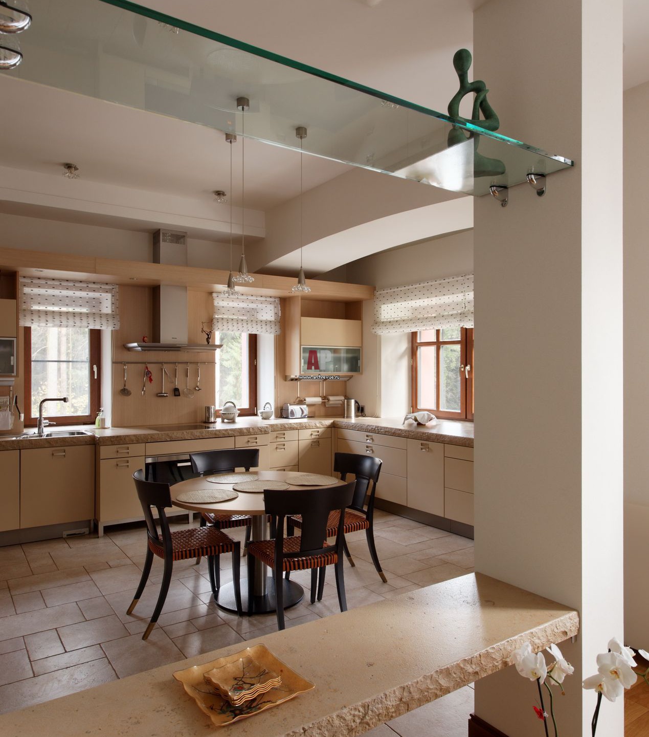 Кухня и столовая визуально объединены. Торец и столешница выполнены из необработанного натурального мрамора, мебель подобрана максимально нейтральная, благодаря чему интерьер выглядит как явление вневременное.