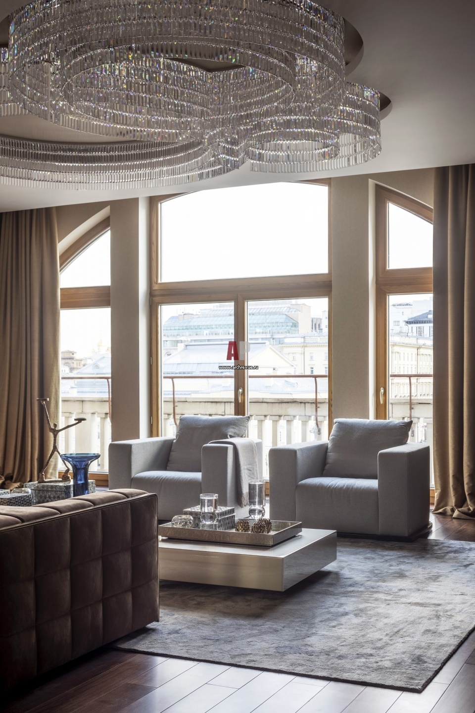 Квартира с видом на центр Москвы. Интерьер гостиной с элементами ар-деко.