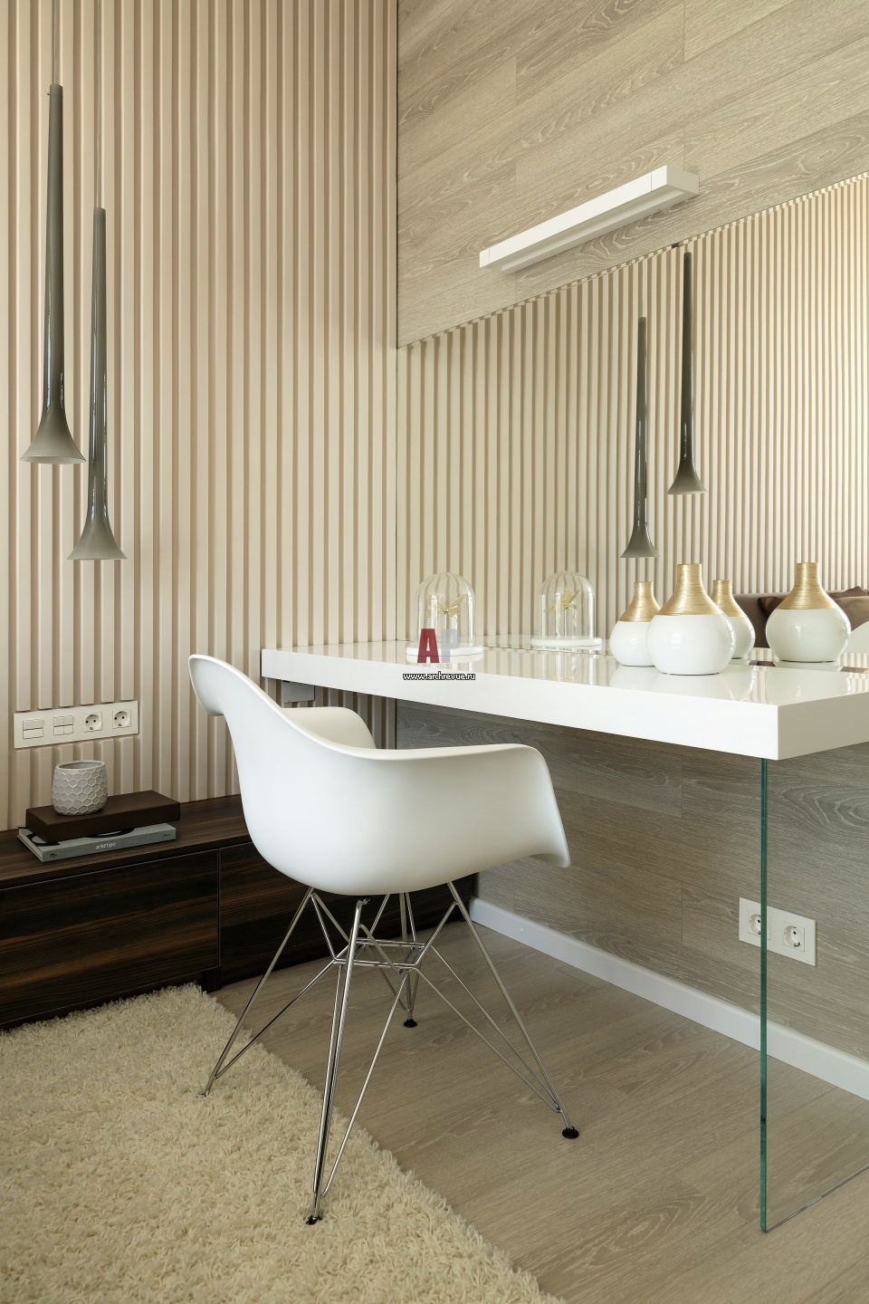 Хозяйская спальня. Туалетный стол (лакированная консоль на основании из прозрачного стекла) в эстетика минимализма сделан на заказ. Кресло, Vitra, Eames, дизайнеры Чарльз и Рэй Имз.