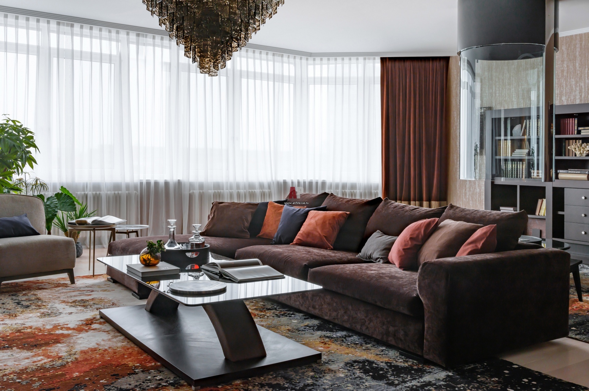 Гостиная разделена на зоны, отчего большое пространство воспринимается более уютным и домашним. Журнальный столик, Smania. Кресло, Flou. Придиванные столики, Alivar. Центральная люстра из муранского стекла, Patrizia Volpato. В «рисунке» ковра собраны все оттенки, используемые в дизайне интерьера.