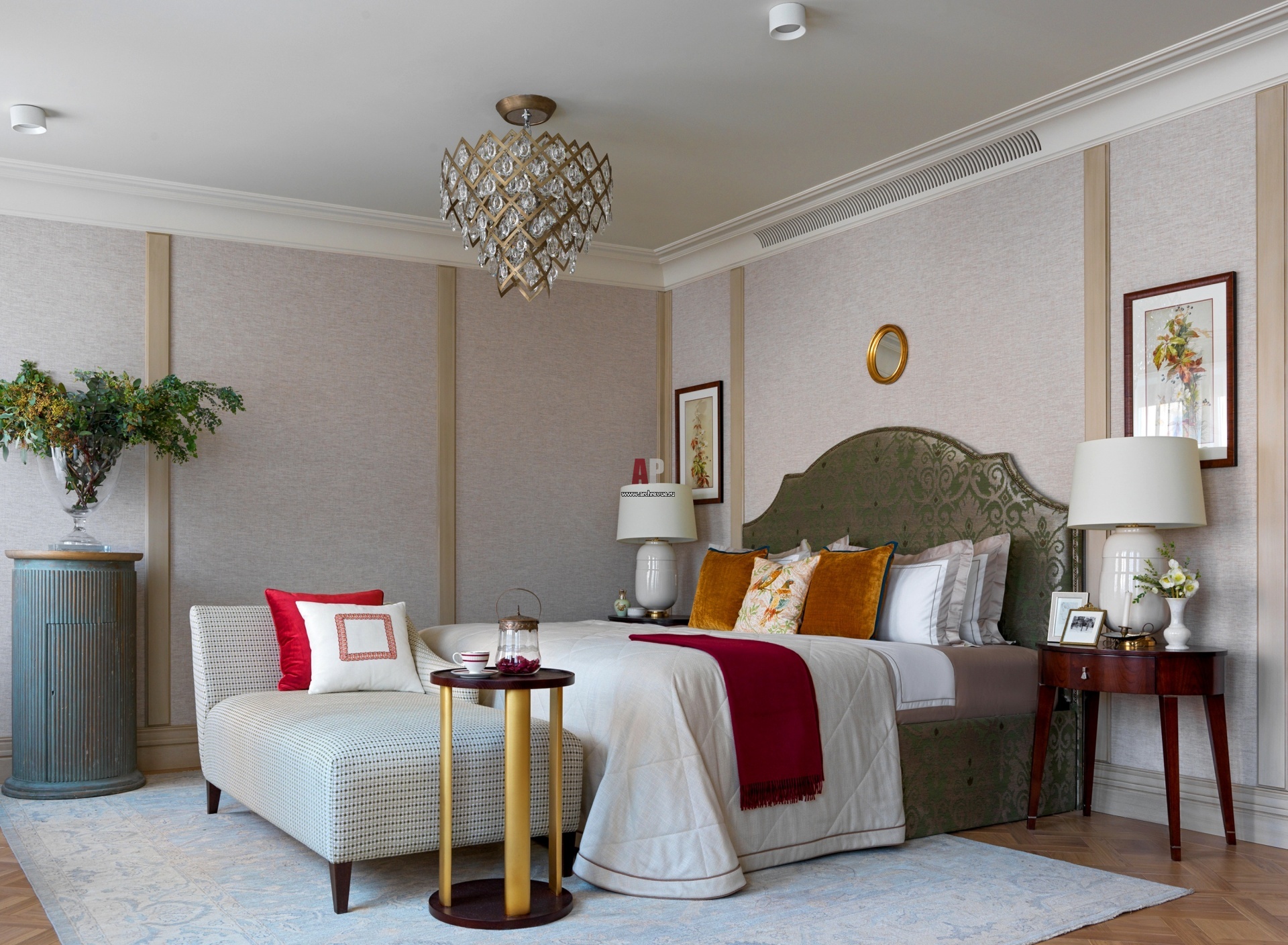 Хозяйская спальня оформлена в теплых охристо-бордовых тонах. Кровать с мягким изголовьем и банкетка, Gnoato Fratelli. Кофейный столик с металлическим декором сделан на заказ. Люстра, Corbett Lighting.