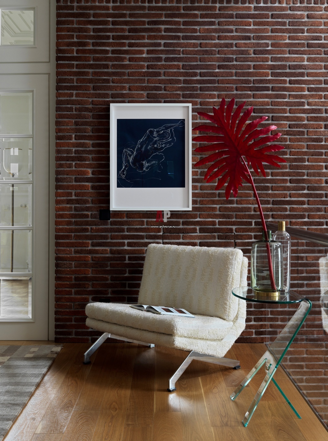 Холл второго этажа с библиотекой и зоной отдыха. Белое кресло у двери в кабинет, Formanova, дизайн Giulio Moscatelli, винтаж, Италия, 1960 г.