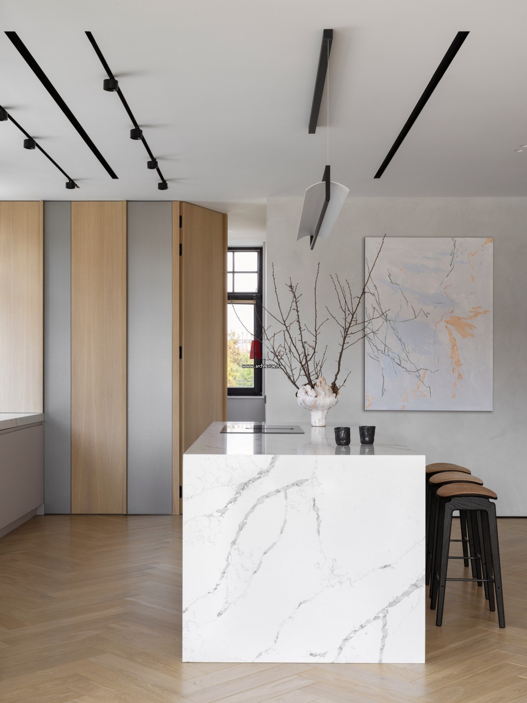 На кухне есть подсобное помещение, вход в него замаскирован под фасад встроенного шкафа.