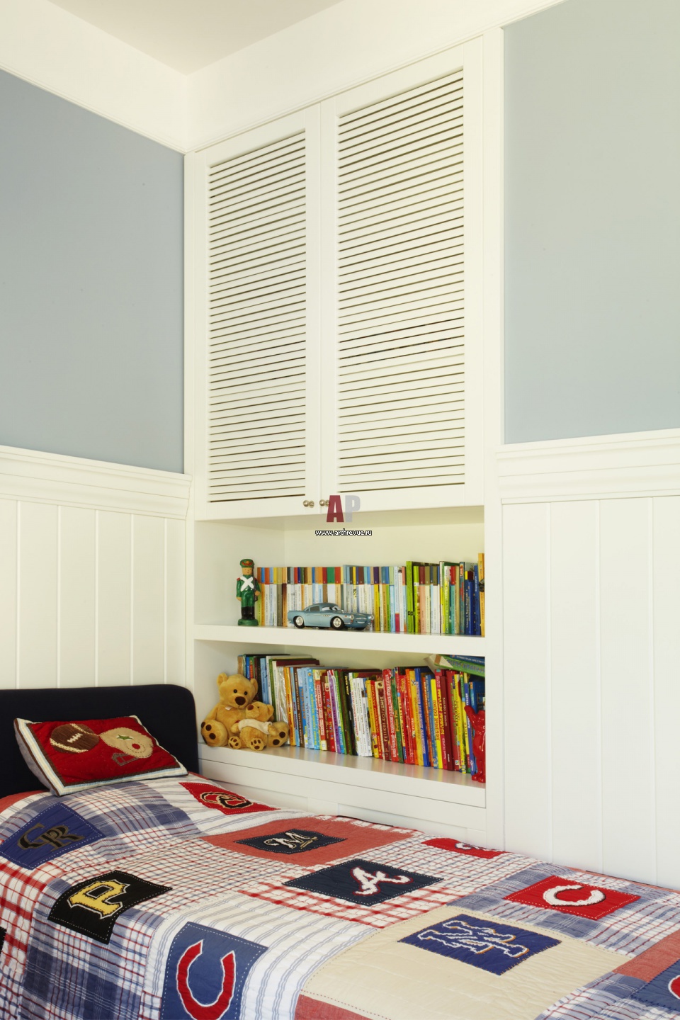 Фрагмент детской. Конструктивные особенности квартиры позволили сделать рядом с кроватью небольшую нишу для книг.