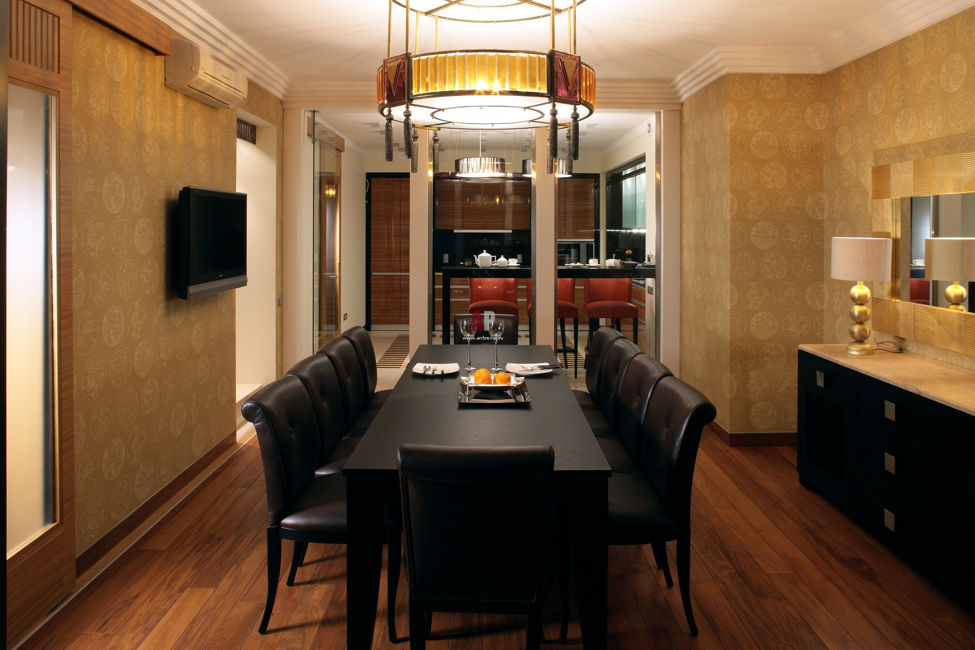 Столовая в золотисто-шоколадной цветовой гамме. Стилистику ар-деко поддерживает уникальная люстра. Она создана художником Еленой Дубской по эскизам автора проекта, с использованием бронзы и стекла ручной работы.