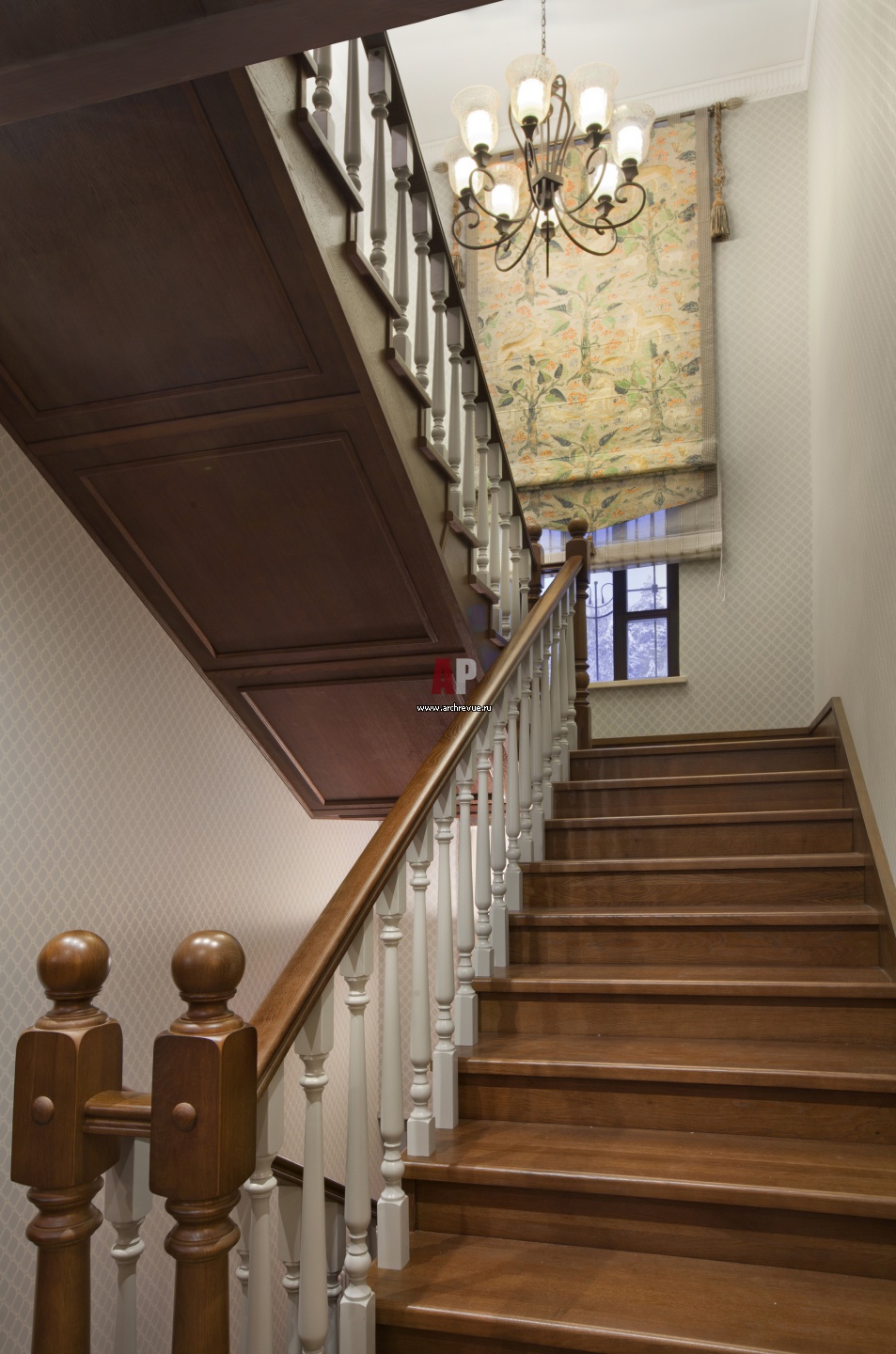 Фото интерьера лестничного холла с деревянной лестницей. Оформление окон в замковом стиле.