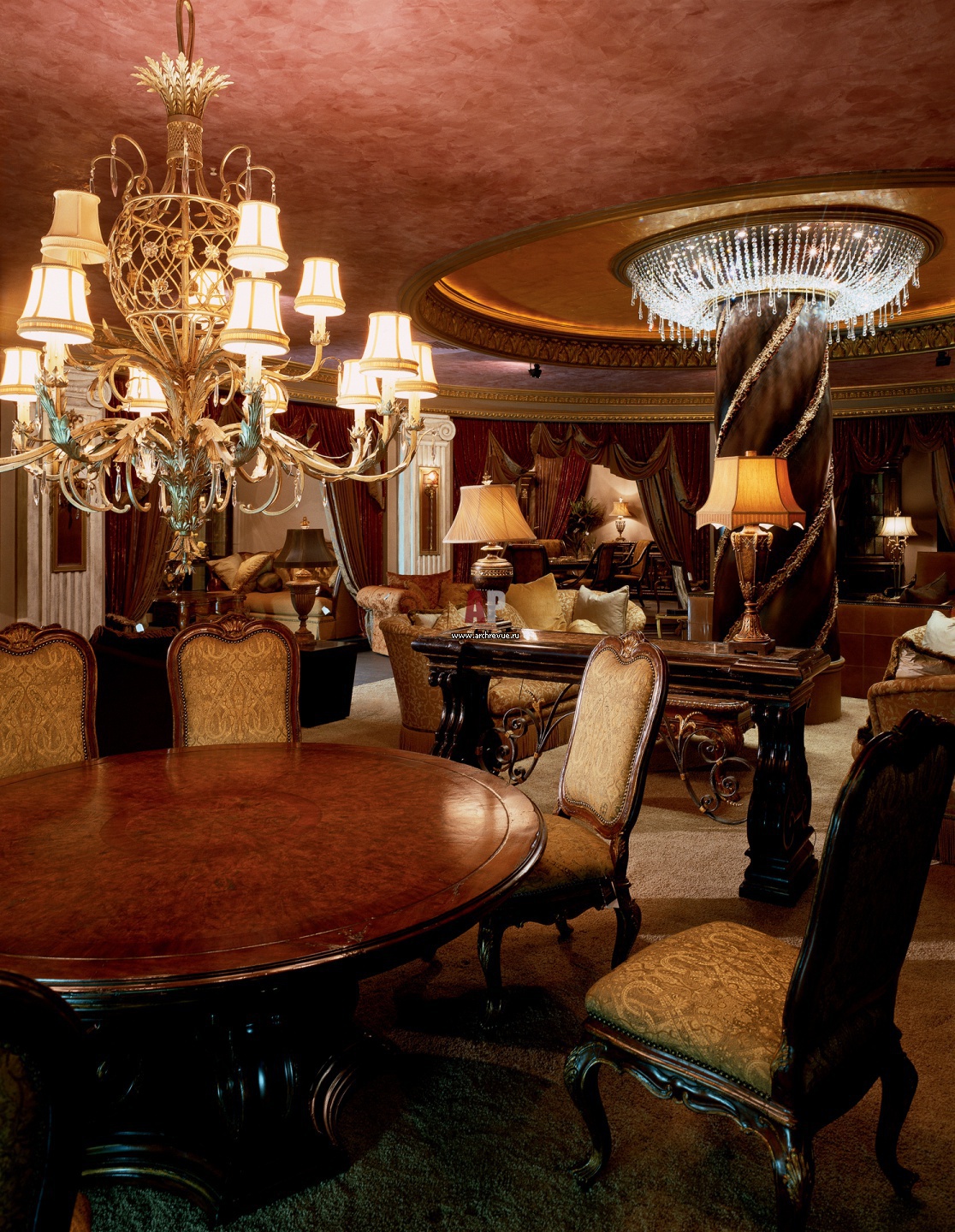 На фото – проект интерьера салона мебели в дворцовом стиле. Потолок украшен бордовой венецианской штукатуркой с бронзовым финишем. Карнизы и полуколонны с классическими капителями выполнены из гипса с позолотой.