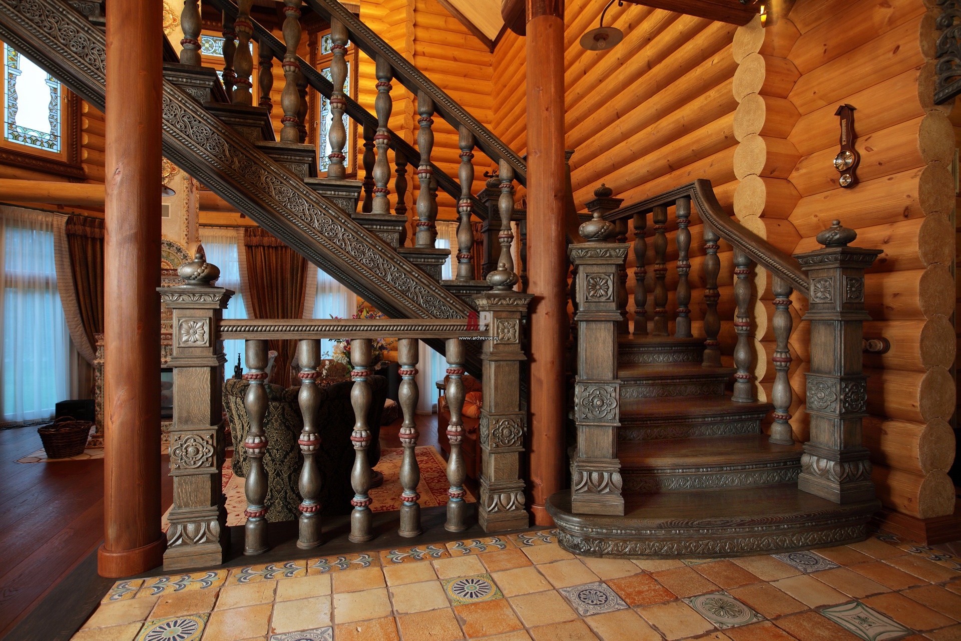 Деревянная лестница смотрится ажурной благодаря резным косоурам и подступенкам. Поверхности обработаны специальным образом с эффектом старения.