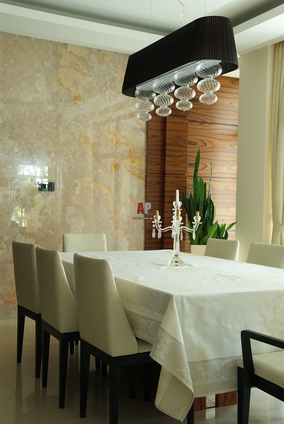 Фрагмент интерьера столовой дома в современном стиле. Обеденный стол, стулья Mobilidea. Светильник над столом Vintage (модель Musa SO).