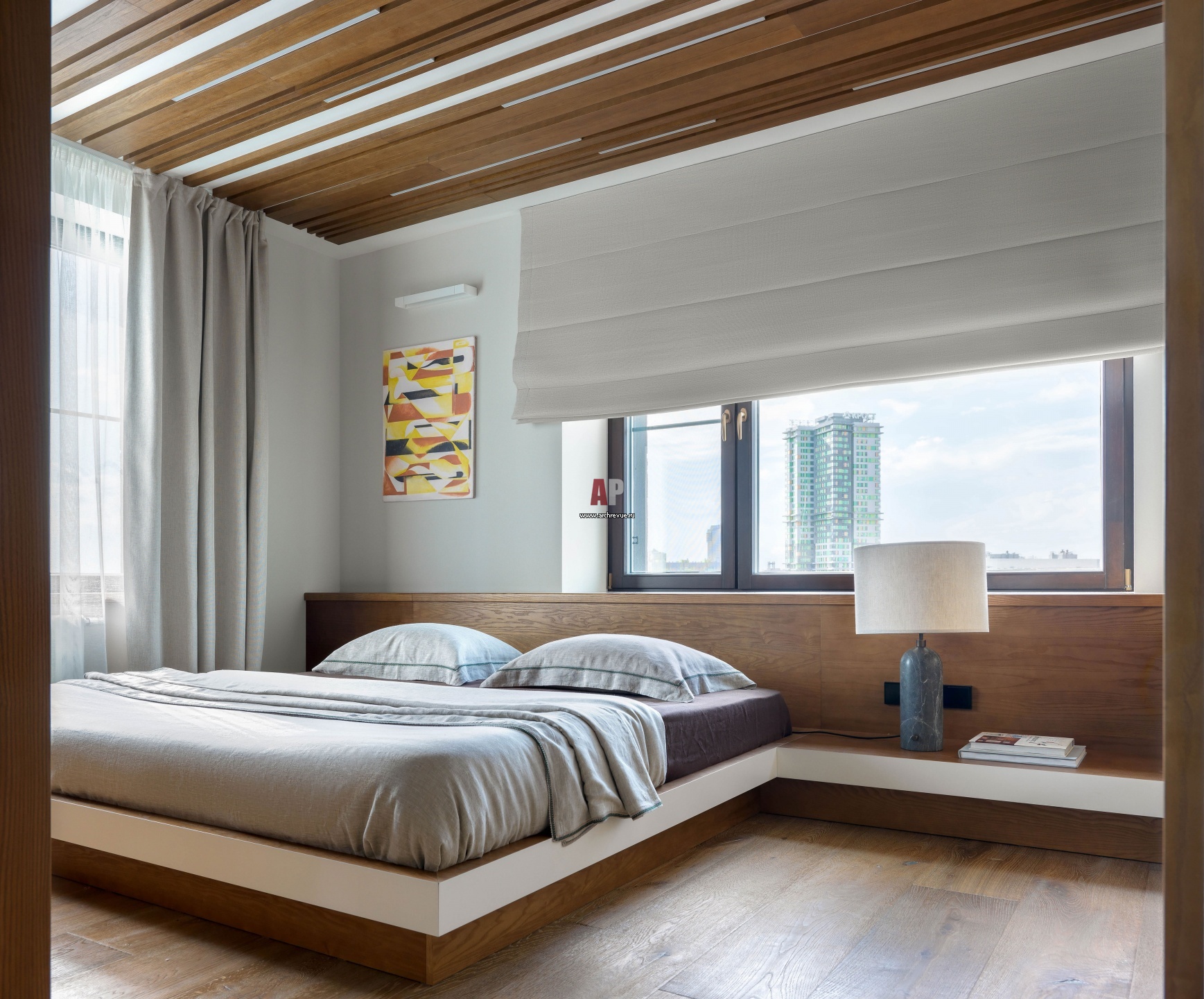 Интерьер мастер-спальни. Кровать из тонированного дерева сделана на заказ, она исполнена как единая конструкция с прикроватными тумбами.