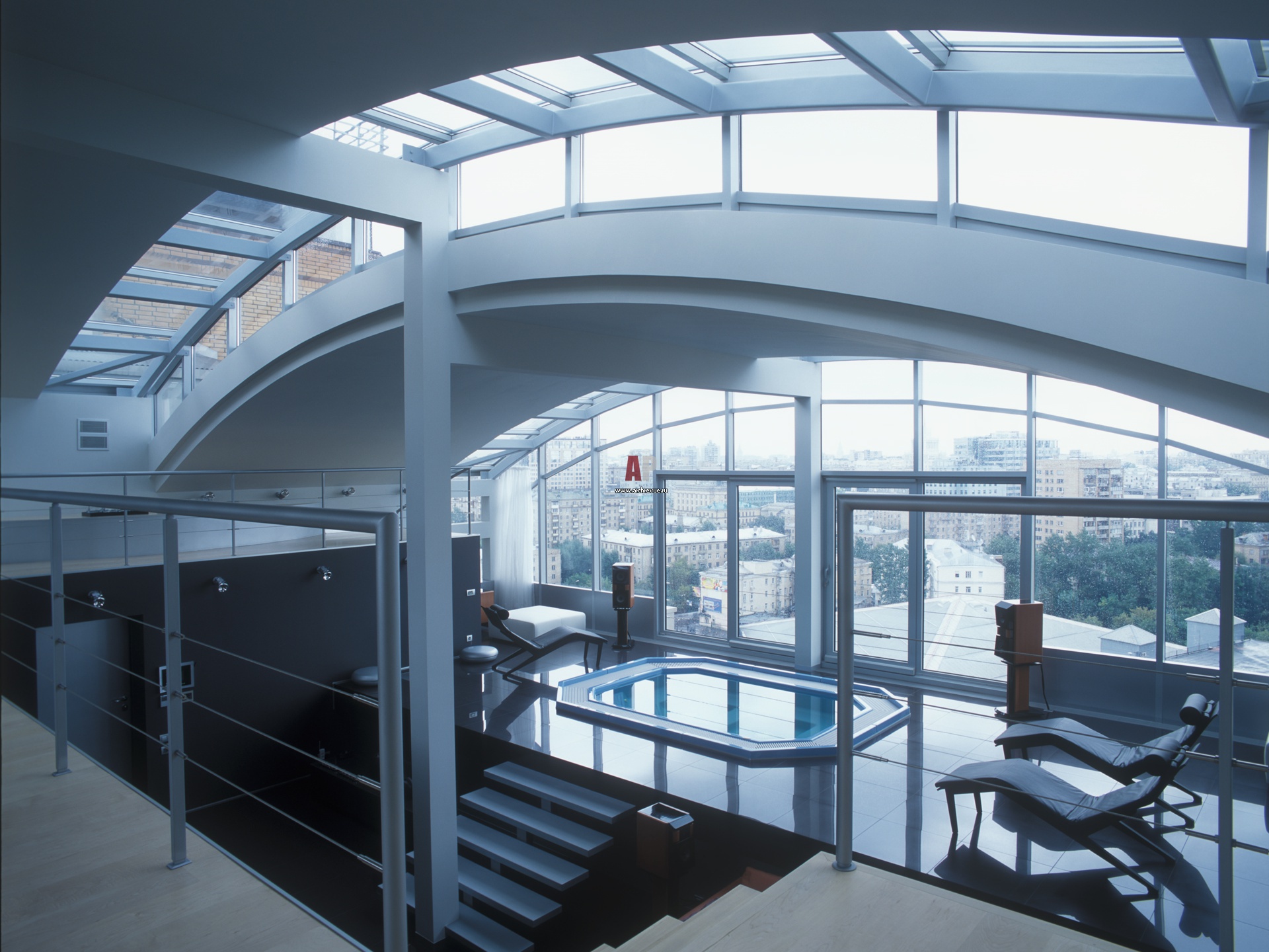 Двухуровневый пентхаус завершает павильон, построенный на крыше дома. Павильон поставлен на самом краю крыши, он опирается на несущие конструкции дома. А так как заказчик любит высоту, экстремальные ощущения, то стену, которая является продолжением стены дома, сделали из стекла.