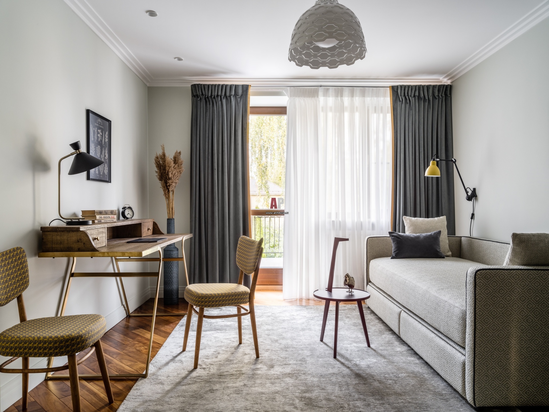 Кабинет в скандинавском стиле. Стол, Dantone Home. Светильник, Louis Poulsen кресло Carl Hansen & Son. Столик, Cattelan Italia.