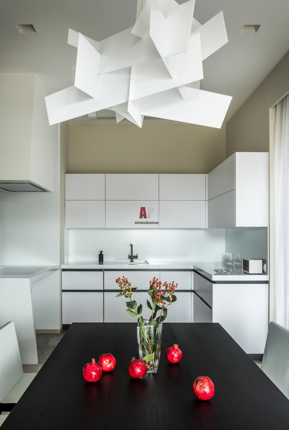 Ломаные форма кухни подчеркивает светильник, Foscarini, модель Big Bang. Кухонная мебель, Leicht.