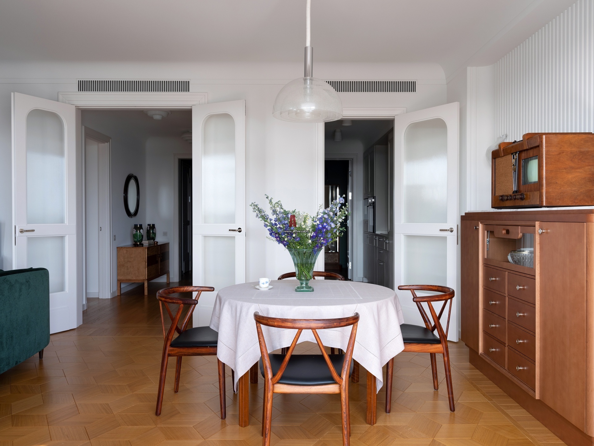 Ретро-квартира для коллекционера. Cтол, дизайн Нильса Йонссона, Швеция, 1960-е гг. Стулья, дизайн Хеннинга Кьернульфа, Bruno Hansen, Дания, 1950-е гг. Люстра Mazzega 1946, Италия, 1970-е гг.