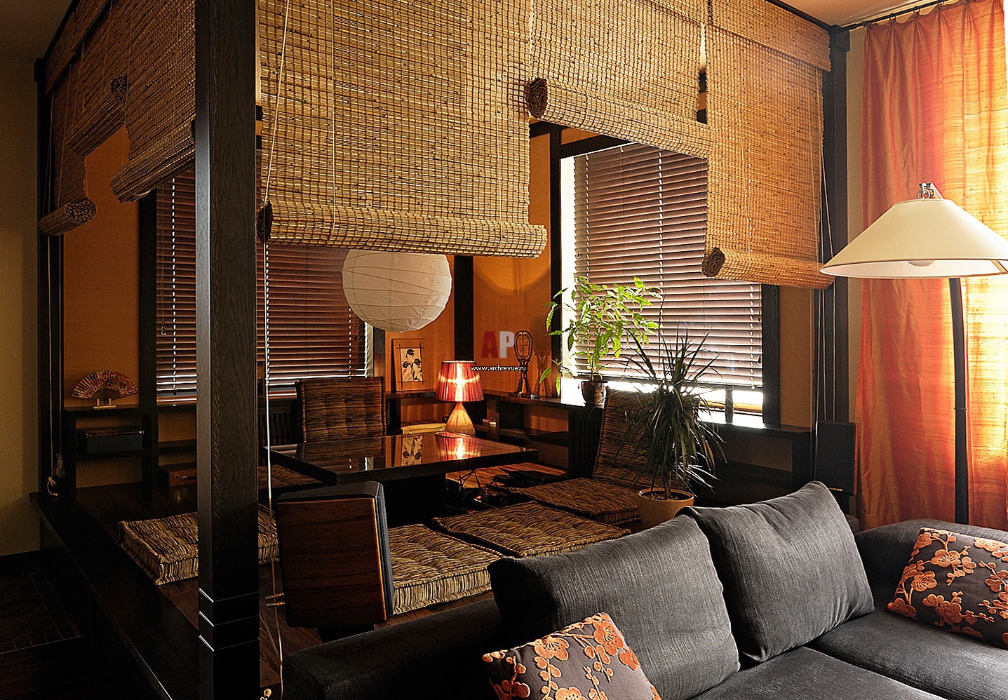 Фото дизайна квартиры в восточном стиле с японскими мотивами. Диванные подушки из серой ткани украшены вышивкой в виде оранжевых веток сакуры.