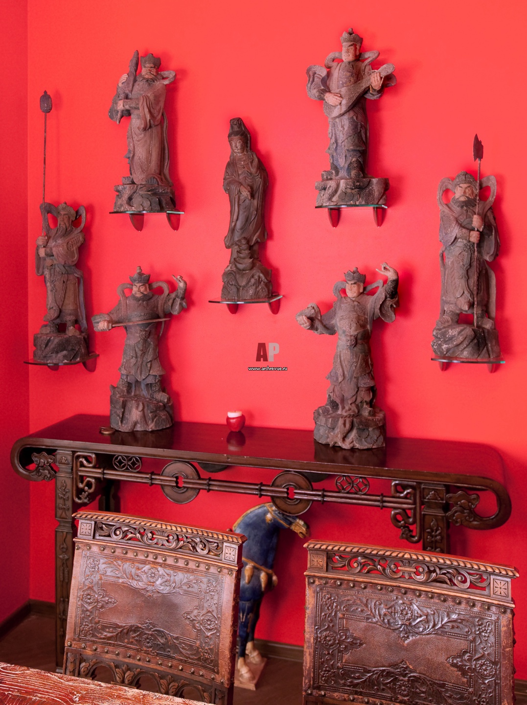 Стены переговорной выкрашены в насыщенный красный цвет. На стеклянных полках – китайские антикварные статуэтки из дерева.