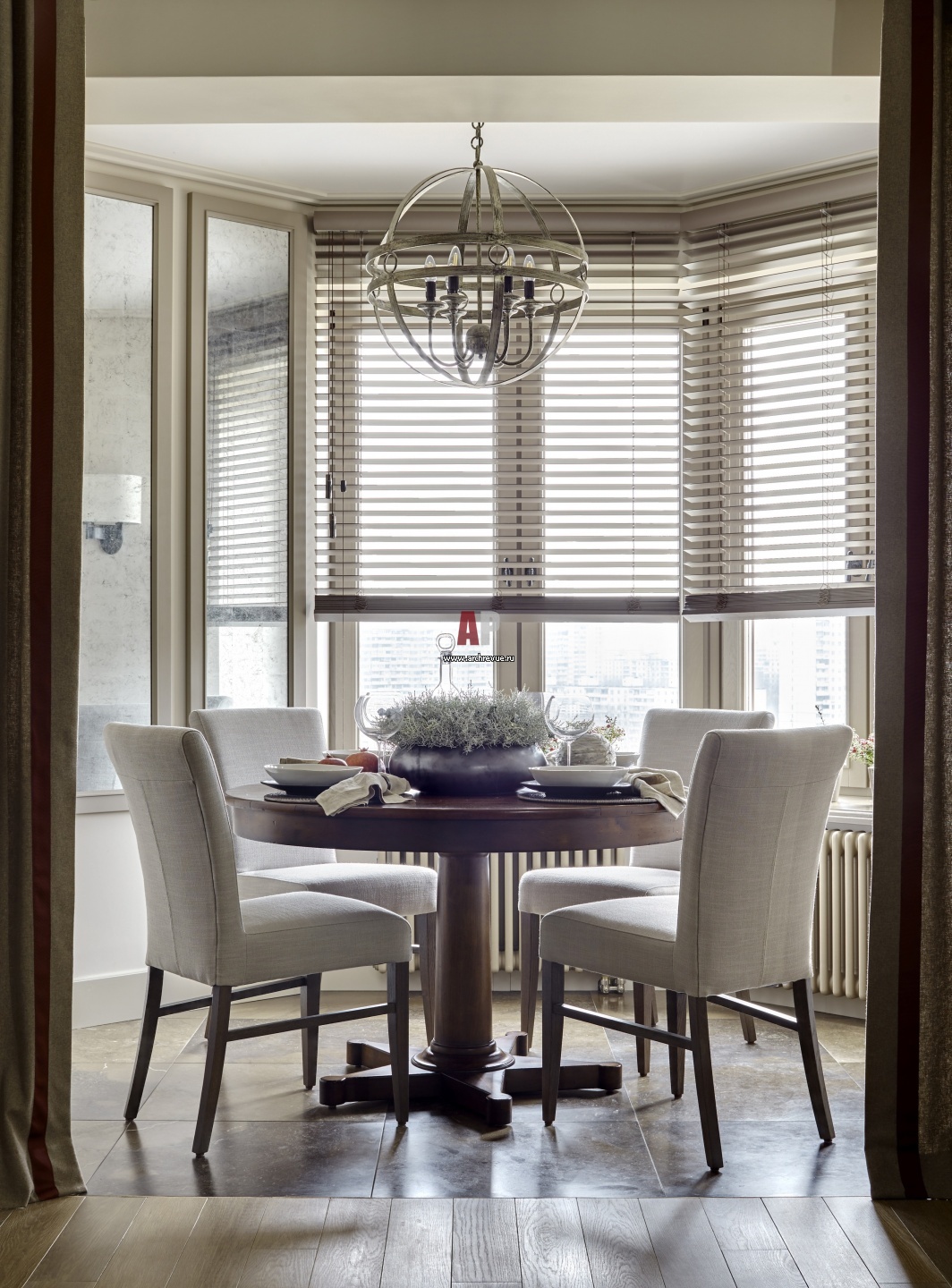 Обеденная зона, зима. Эркер визуально отделен от зоны отдыха при помощи смены материала на полу и декоративных штор из шерсти. Раскладной обеденный стол, Century Furniture. Стулья в льняной обивке, Charrell.
