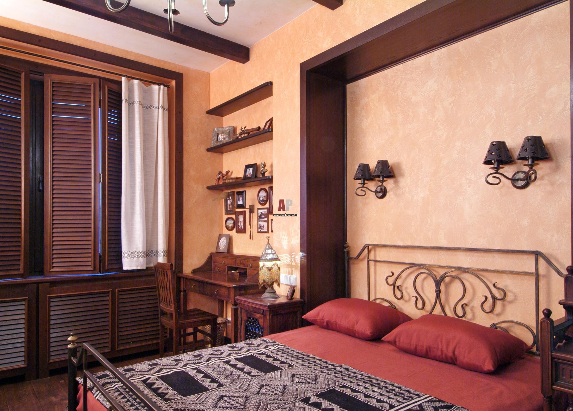 Спальня выполнена в испанской стилистике, изготовитель «Ю Мебель». Изголовье кровати вписано в деревянный портал, окна декорированы деревянными ставнями. Стены отделаны декоративными покрасками.