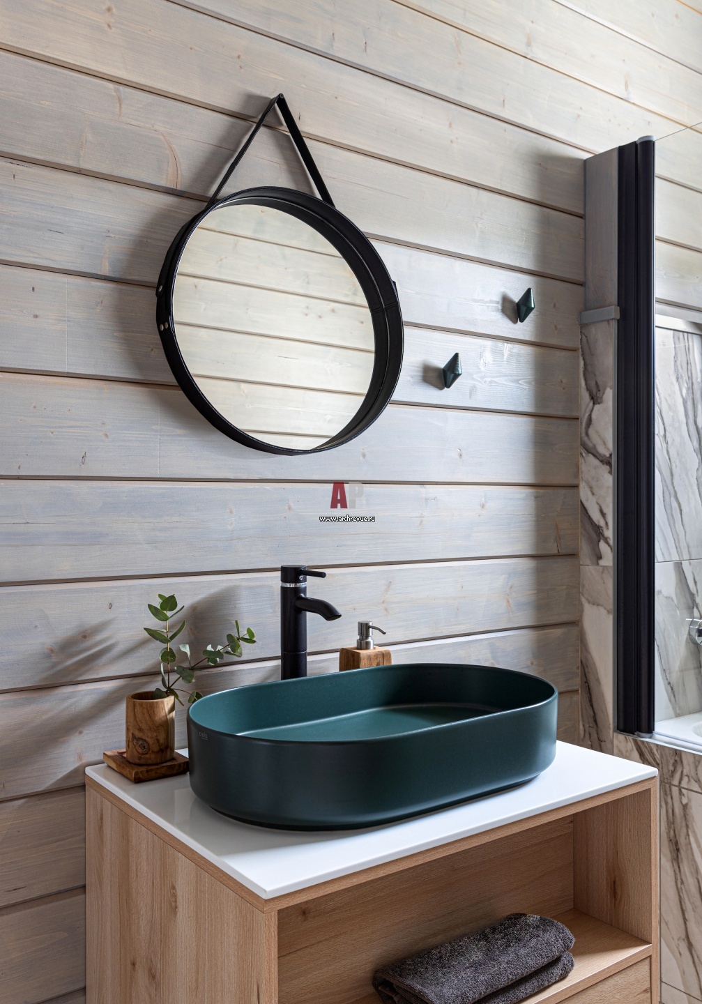 Интерьер гостевого санузла в деревянном доме для большой семьи. Разноцветная сантехника, Ceramica Cielo. Плитка, Atlas Concorde.