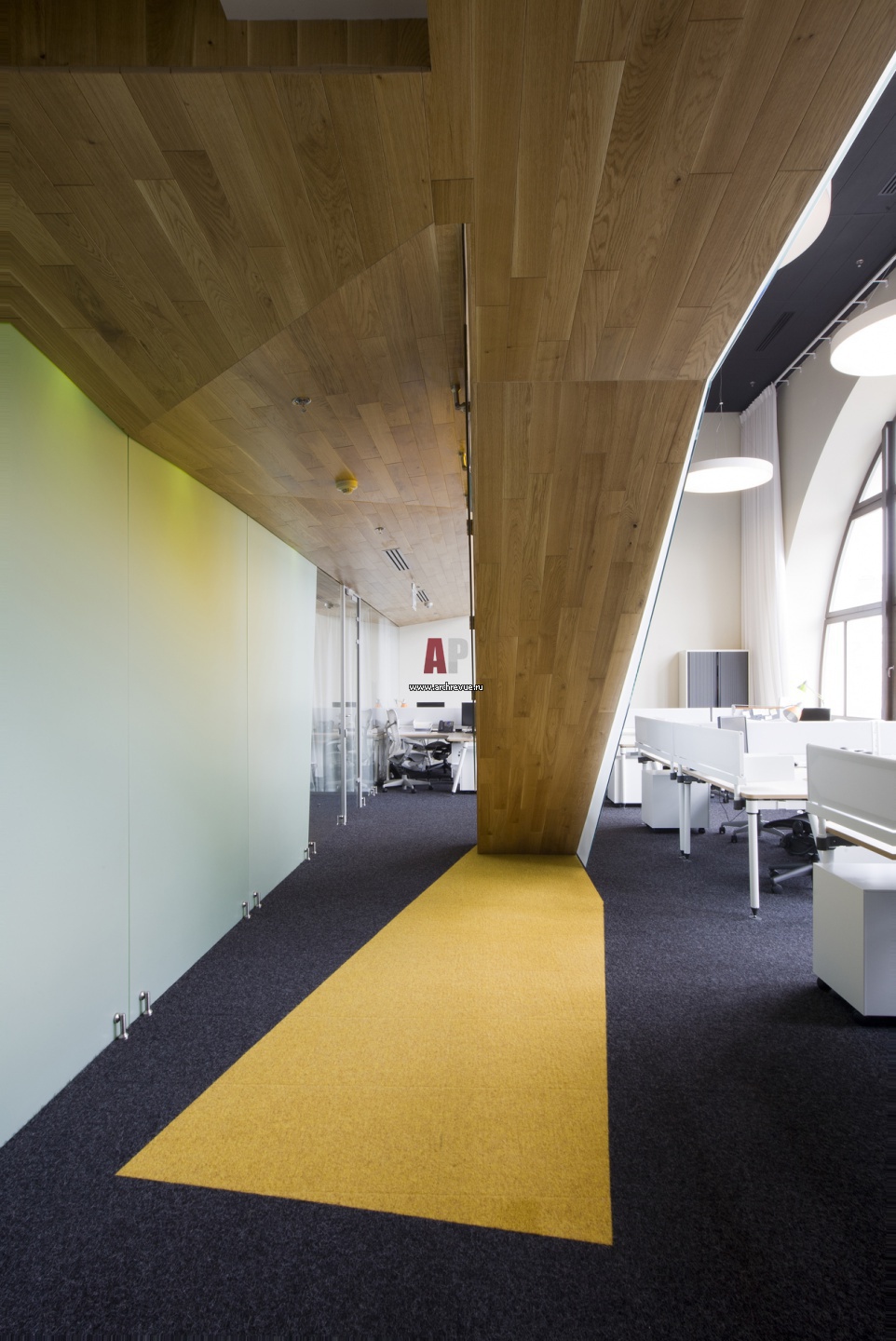 Фрагмент желтого ковролина на полу – проекция конструкции лестницы. Авторы проекта Петр Зайцев, Арсений Борисенко, архитектурное бюро za bor. Ковролин, InterFace FLOR.