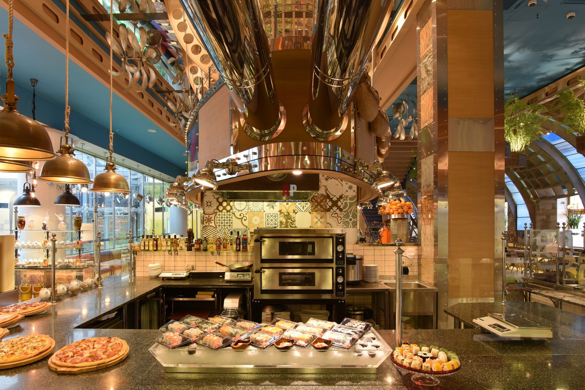 Фото интерьера открытой кухни ресторана в современном стиле