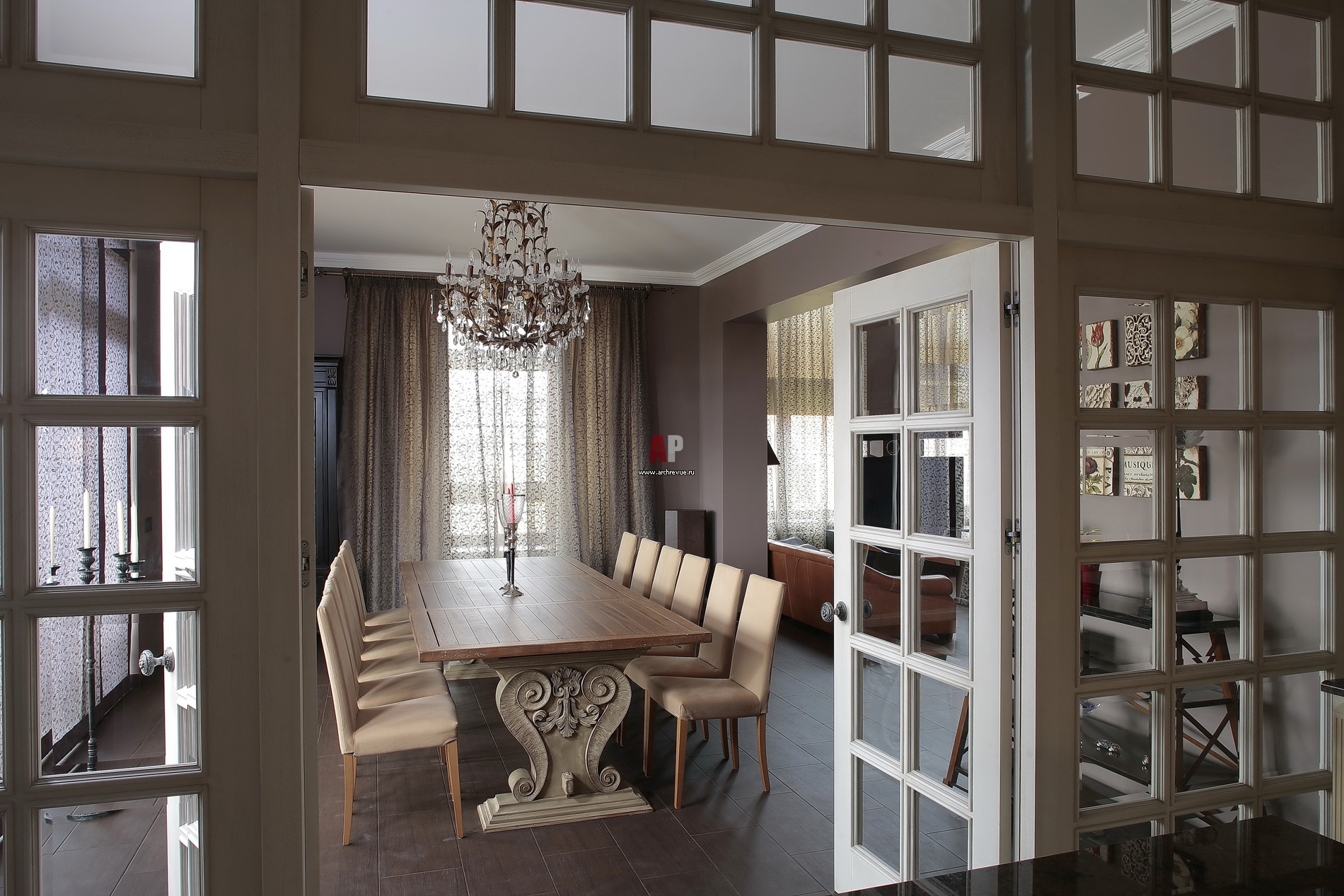 Вид на столовую со стороны кухни. Помещения разделяют двери в стиле Прованс с декоративным филенчатым переплетом. Они сделаны на заказ по эскизам авторов компанией «АМ Дизайн».