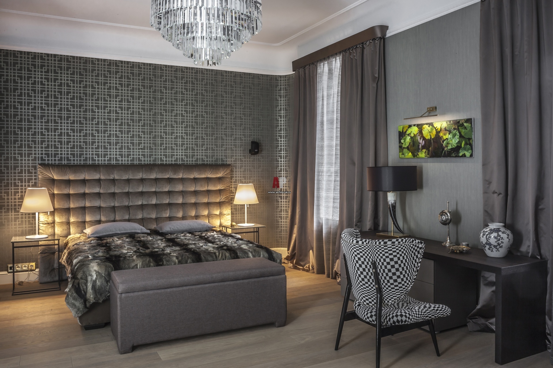 В оформлении женской спальни использованы обои с тем же рисунком, что и в мужской, но другого оттенка. Однако благодаря окружающим предметам они выглядят абсолютно по-разному. Кровать, Flou.