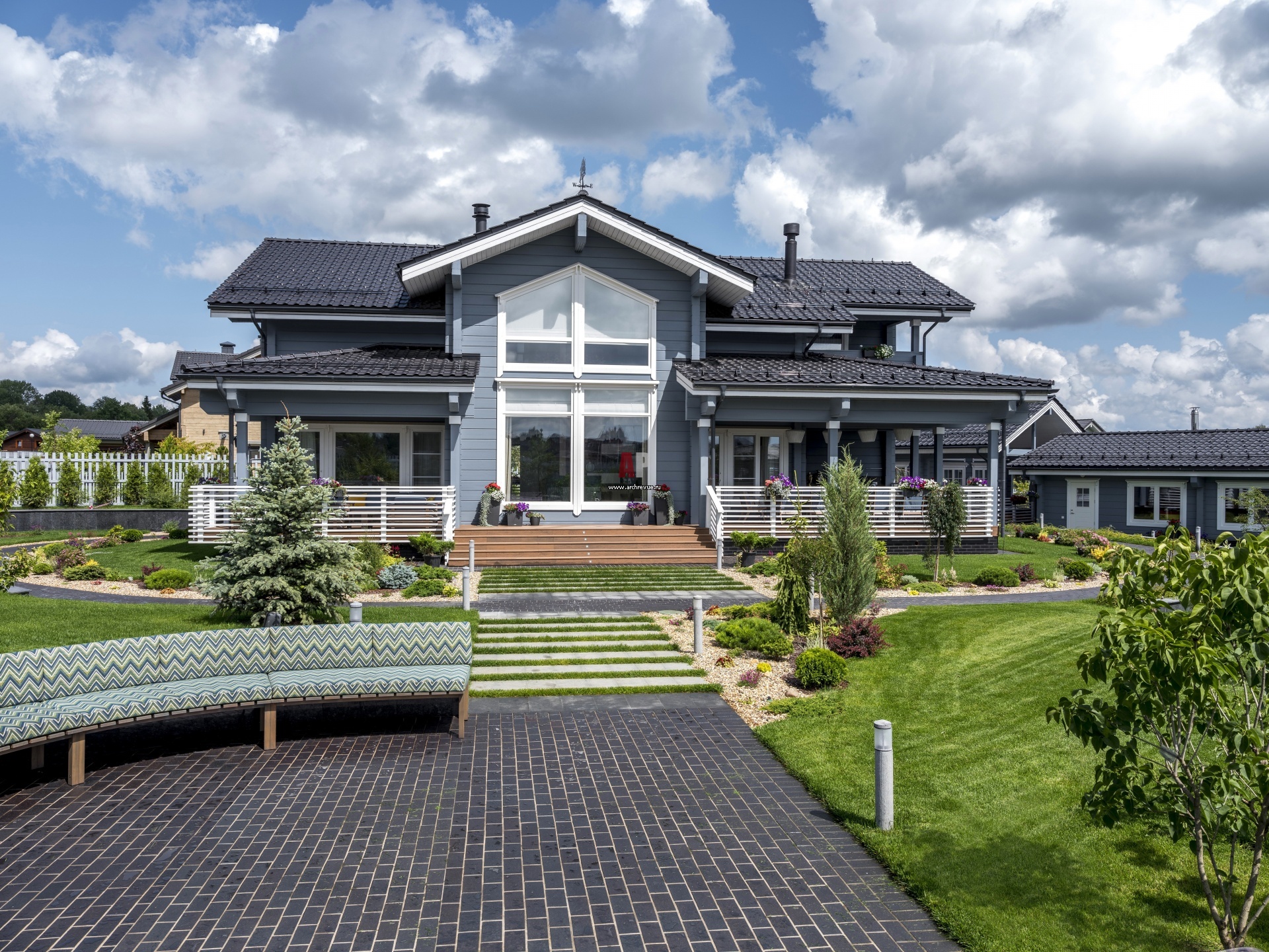 Двухэтажный дом из клееного бруса построен по типовому проекту, который был немного доработан. Кровля, гибкая черепица. Фасады выкрашены в серо-голубой цвет. Обрамление окон и ограждение террас исполнены в белом цвете. Справа от дома – баня, спроектированная Александрой Афанасьевой.