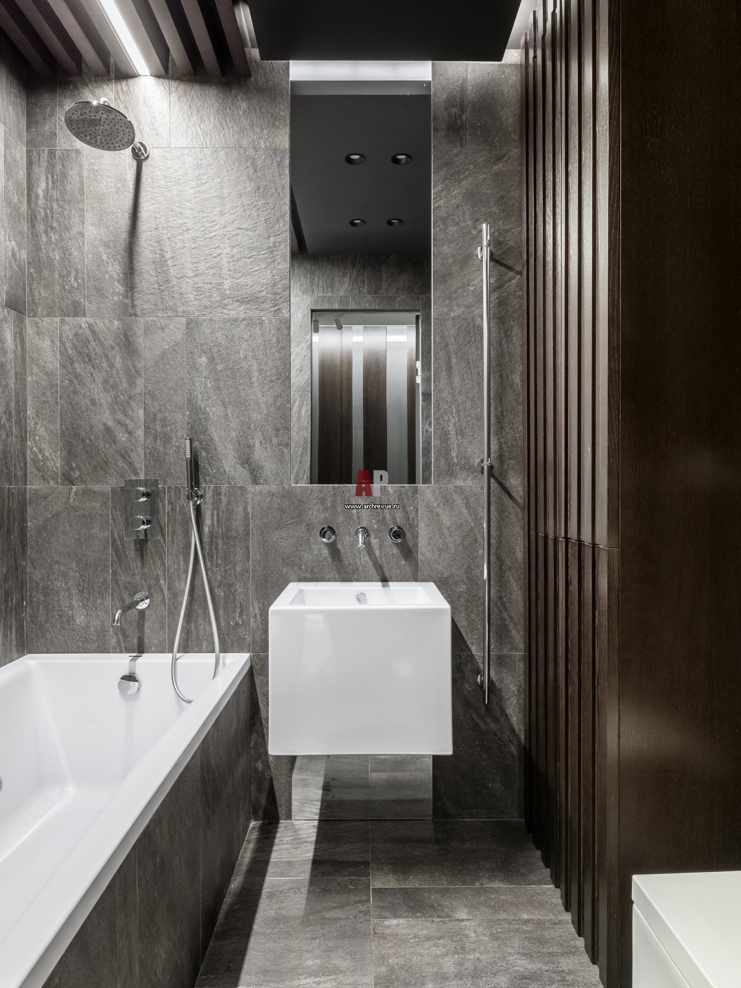 Стены в санузле облицованы керамогранитом с текстурой под бетон. Шкаф сделан на заказ, за его фасадом спрятаны стиральная машина и полки для хранения полотенец. Сантехника, Simas.