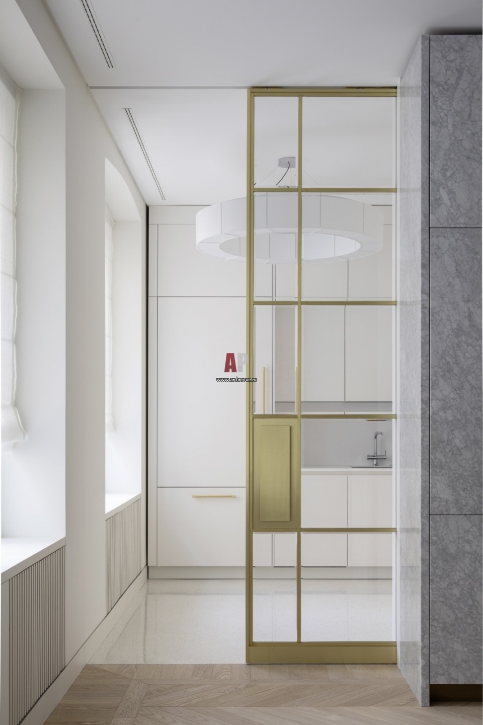 Белая квартира с латунными витражными дверями