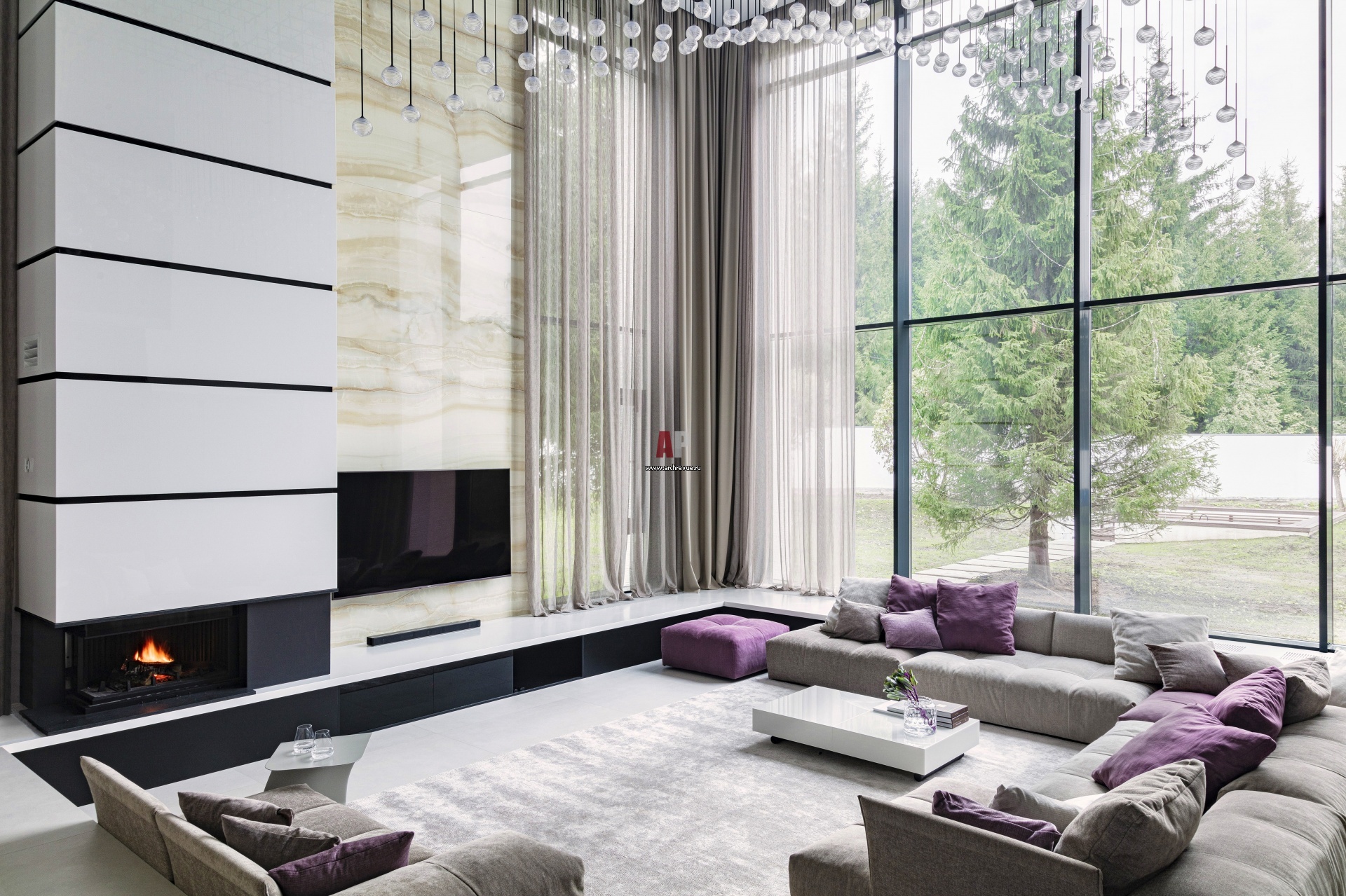 Зона отдыха в двусветной гостиной. Модульный диван, Saba Italia, модель Pixel. Журнальный столик, Bonaldo.