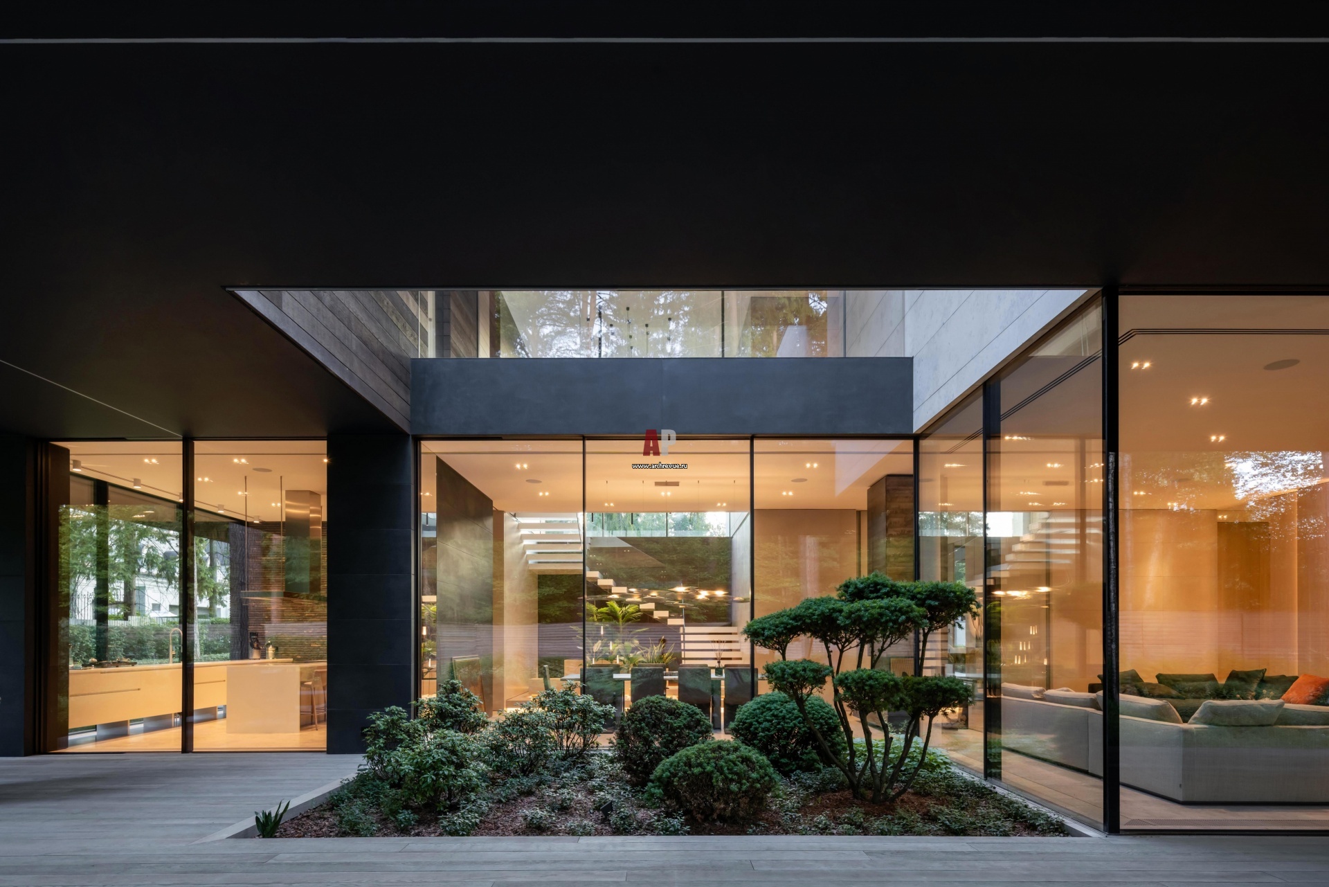 Современный дом в сосновом бору. Внутренний двор с садом.