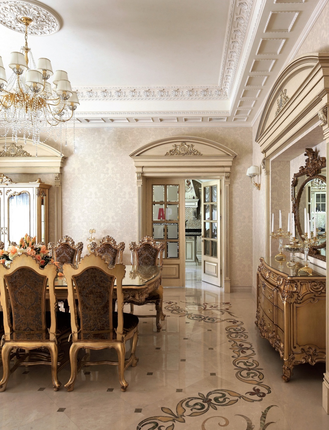 Деревянные порталы и ниши в столовой украшены арочными карнизами-сандриками.