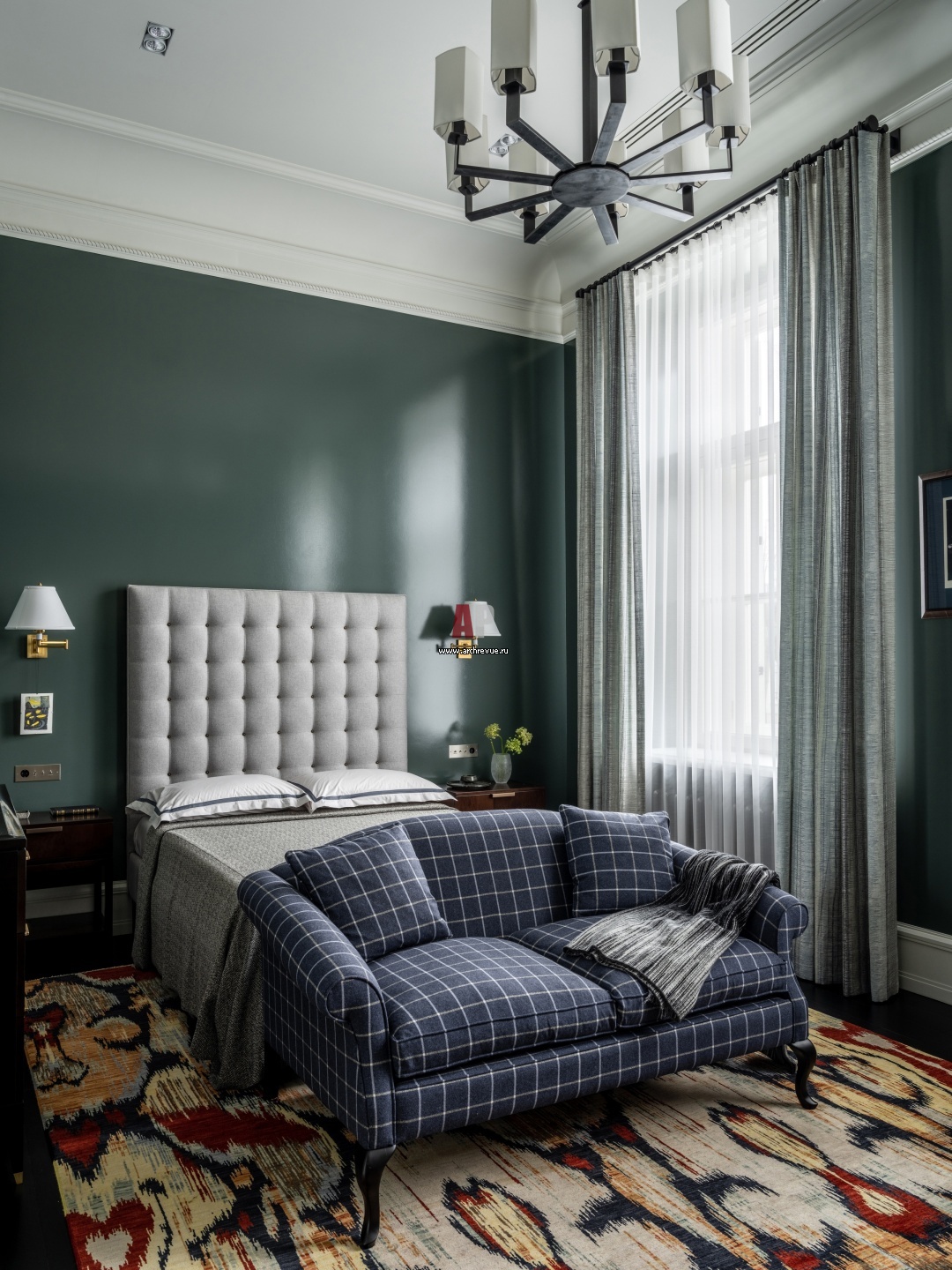 Стены в одной из двух гостевых спален выкрашены темно-зеленой глянцевой краской. Ее окна выходят на юг, и глубокий темный цвет стен делает комнату более уютной и камерной, а глянец придает мерцания и загадочности, особенно вечером при включенных светильниках.